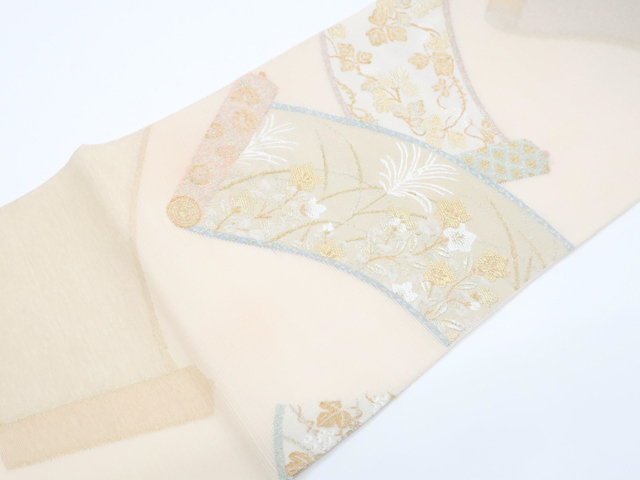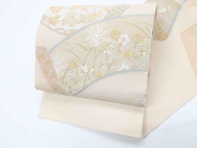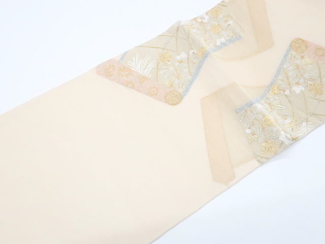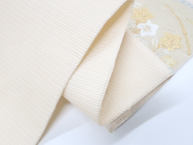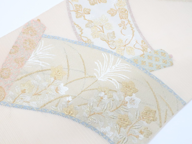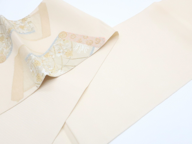 リサイクル商品の為、お太鼓・前柄・無地場に薄汚れがございますがご着用いただけると存じます。 地色は薄橙です。 1枚目の画像が近いお色かと思われます。 素材は正絹です。 |