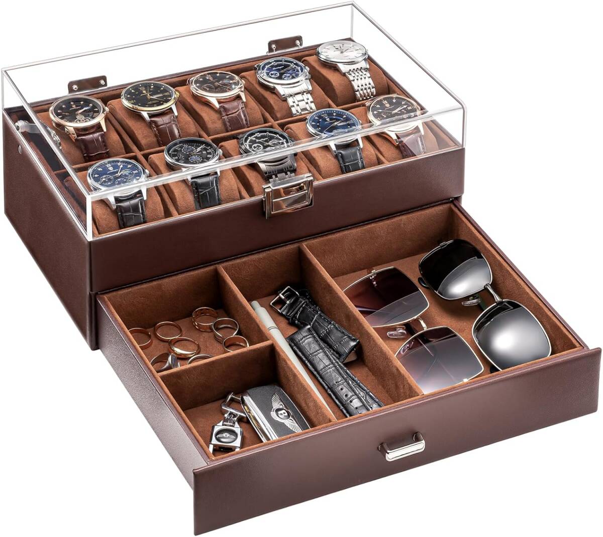 腕時計収納ボックス 腕時計ケース ブラウン PU製 10本用 ウオッチコレクションケース 男性 収納ボックス ガラス蓋 ディスプレイケース