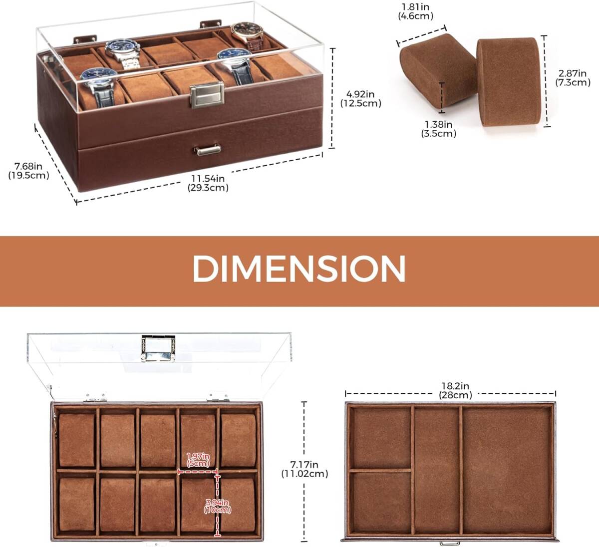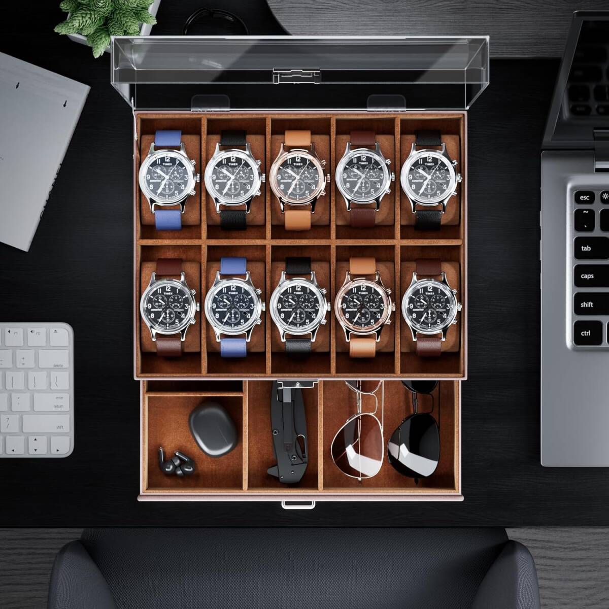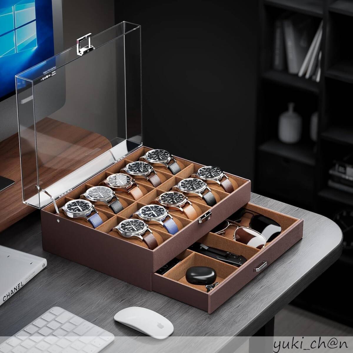 この腕時計収納ボックスは、10本の腕時計を収納できるスタイリッシュなデザインが特徴です。