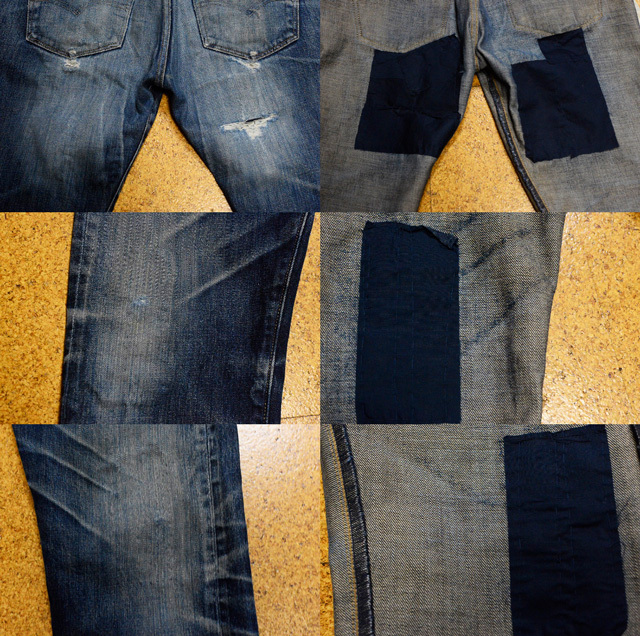 【ヒゲ、アタリ、縦落ち、下りヒゲ、膝裏のハチノス、裾周りのハチノス、フロントボタンのアタリ、アウトシームのアタリ】