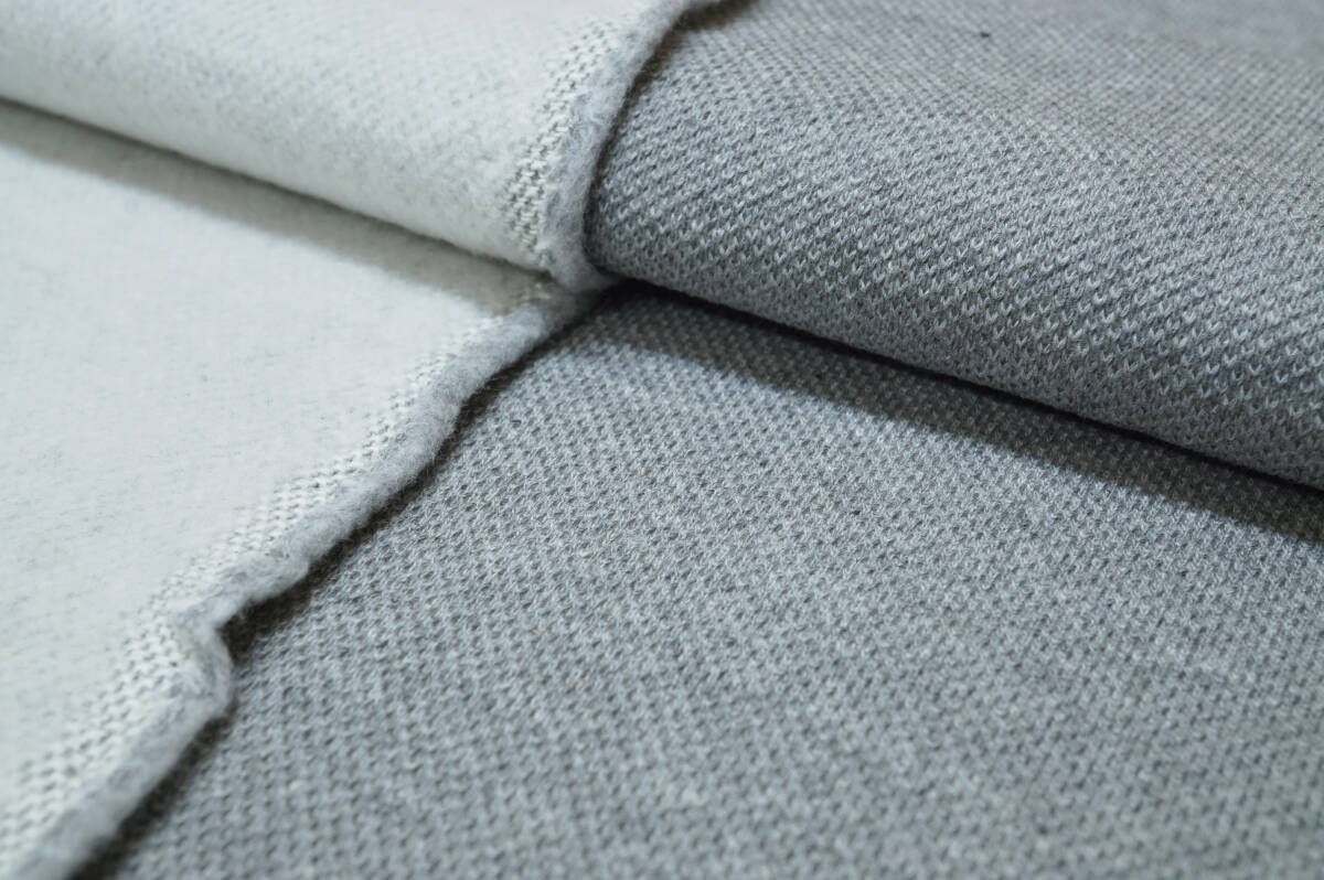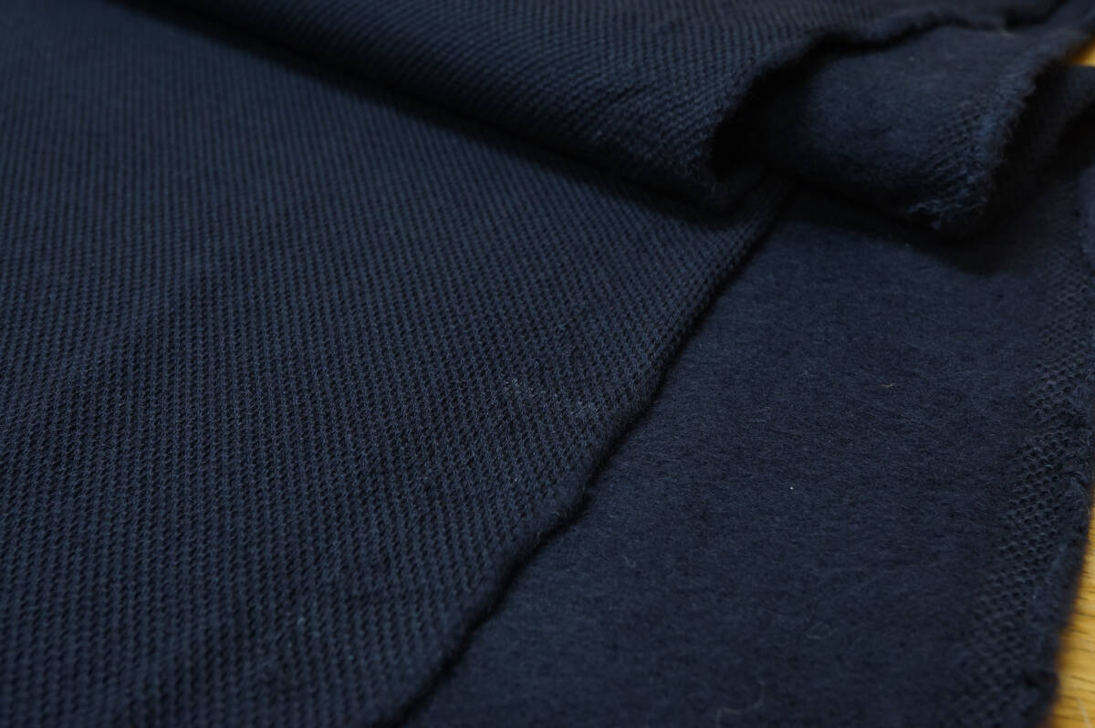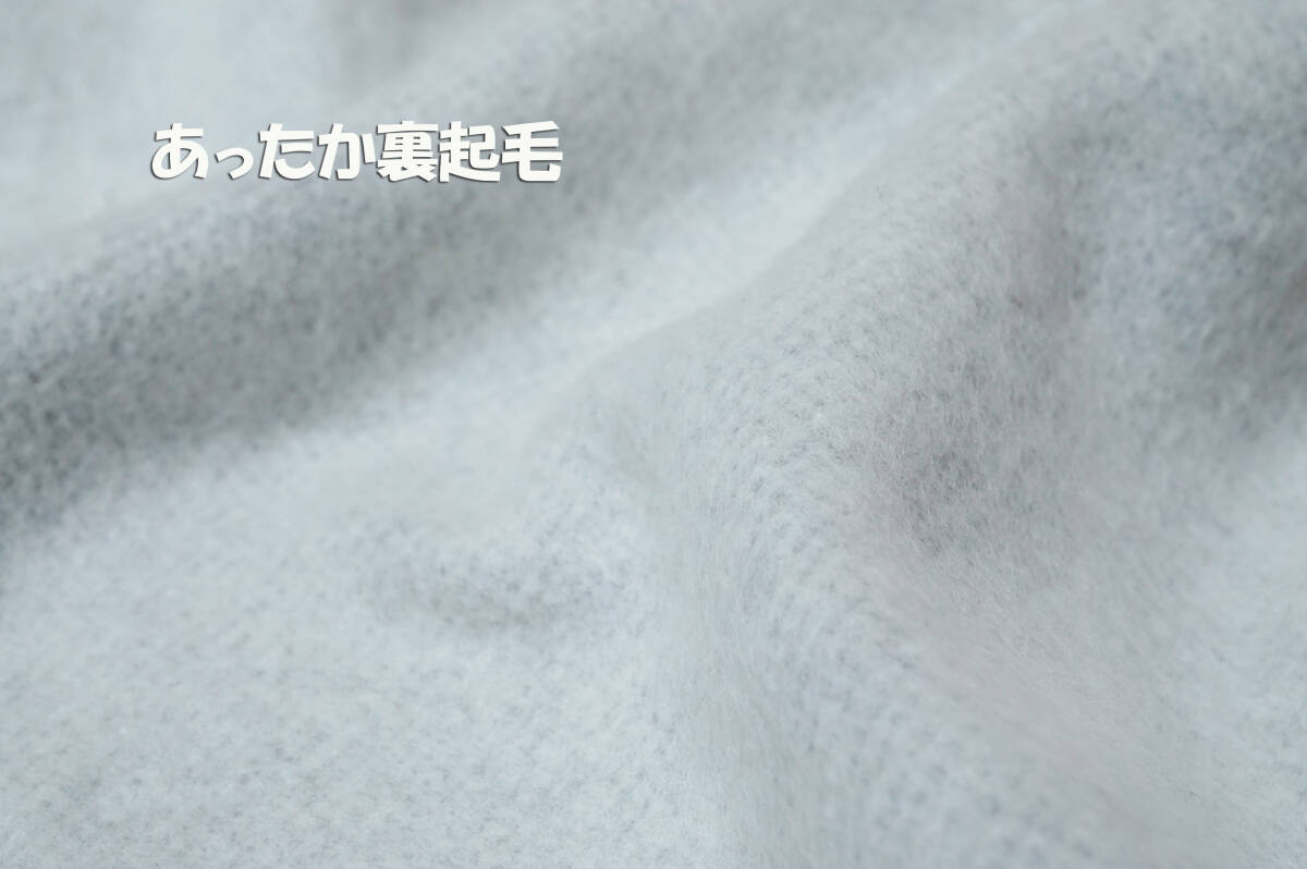 綿100%、厚さは中厚地、硬さは無く、程良い柔らかさがあり、巾方向にほんのわずかに伸びますが、伸縮性はほとんどございません。裏面はあったか起毛の優しい肌ざわりでございます。