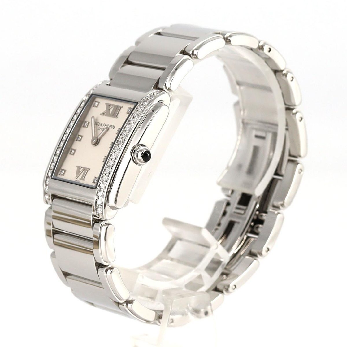 パテックフィリップ往年の名作「ゴンドーロ」を現代の女性に向けてリデザインしたモデル「Twenty-4」。1999年に誕生しました。現在ではこちらのモデルが、パテックフィリップにおける女性用向けの人気モデルとなっています。その中でもこちらは、ホワイトゴールド素材に、ベゼルと文字盤上にダイヤモンドがセッティングされています。業界最高峰メーカーの時計を、輝かしいダイヤモンドと共に身に付けることのできるTwenty-4。輝いている女性の方々に、おすすめの逸品です。