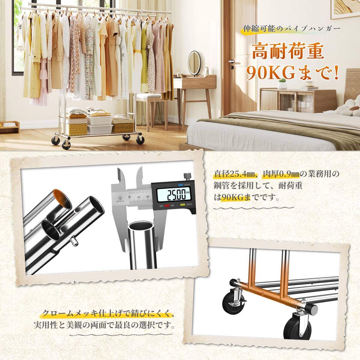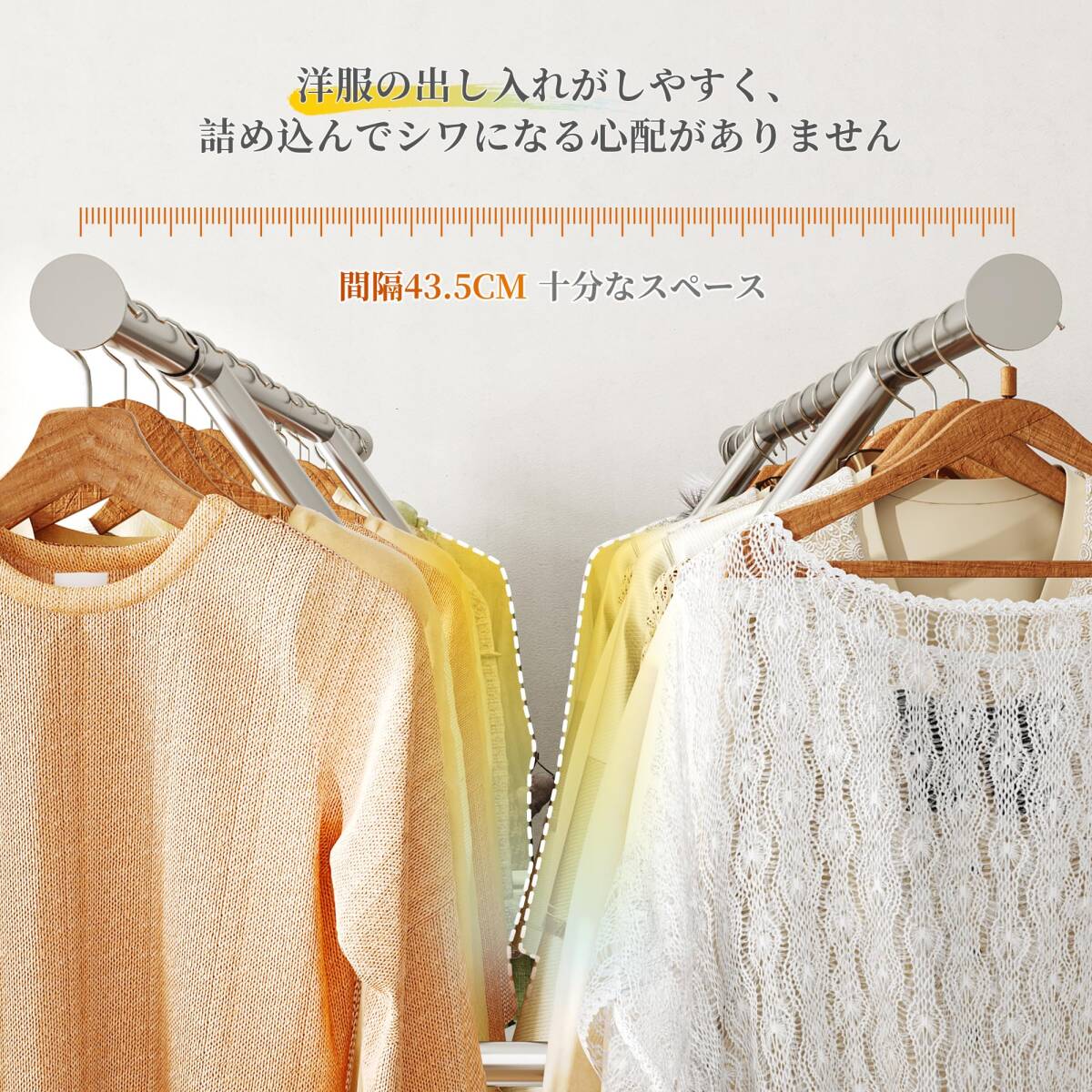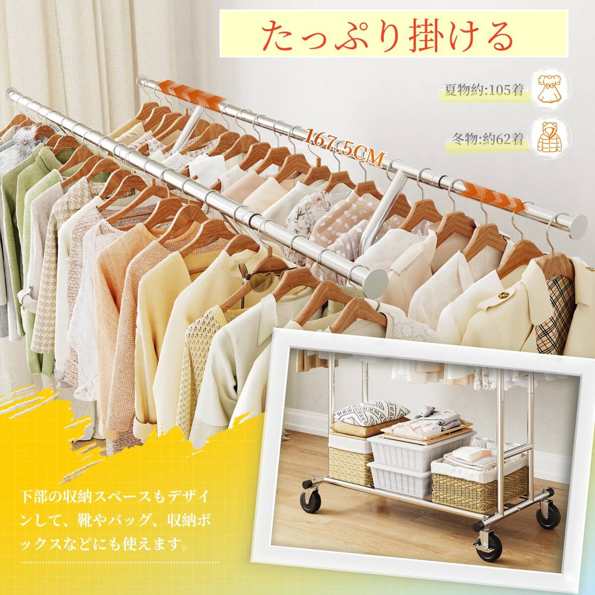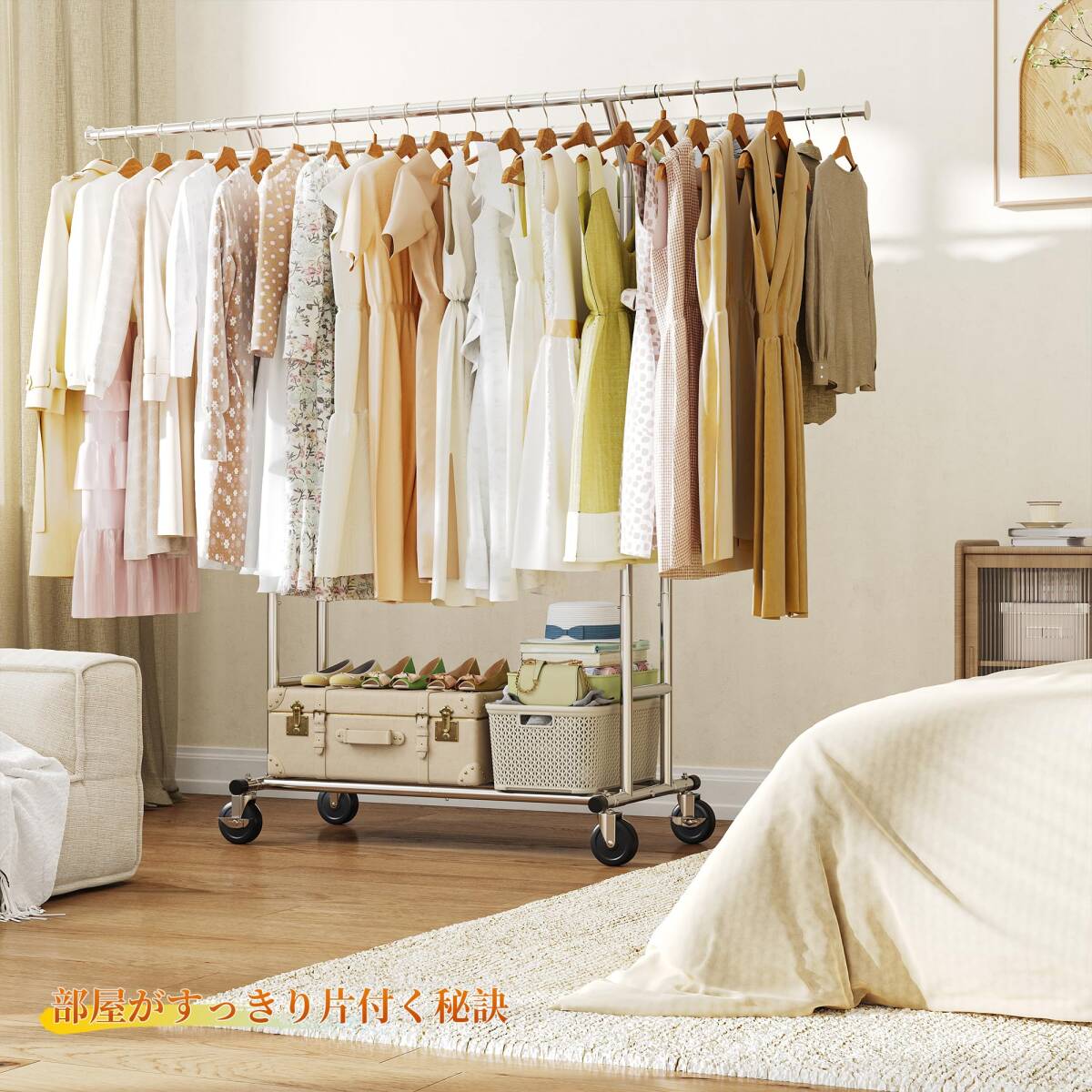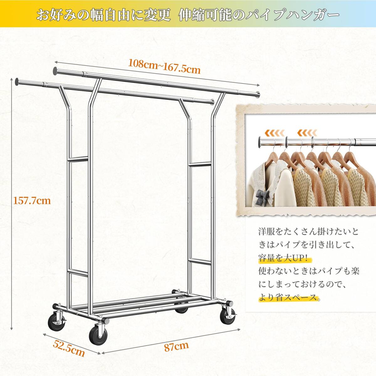 • 【幅108~167.5、伸縮自由自在】サイズ:幅108cm~167.5cm × 奥行52.5cm × 高さ158cm。ご使用のニーズに合わせて、ハンガーラックの幅を簡単に調整できます。パイプラックはお部屋のレイアウトやかけたいものに合わせて自由自在に調整できます。ハンガーラックバーの端が横に伸縮するので、バッグやストールなどをかけられます。ダブルハンガーラック耐荷重は90kgとしっかりとした作りで安心で、ご家庭に限らず業務用にも最適です。