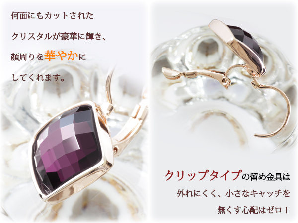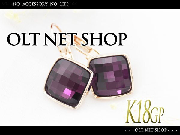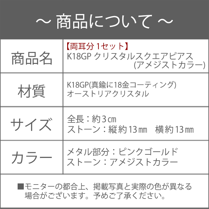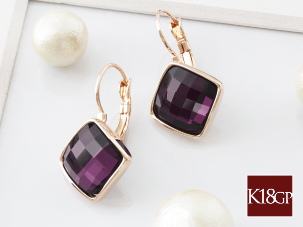 新品/ピアス/K18GP/アメジスト/クリスタル/18金/ピンクゴールド/レディース/両耳/リング/四角/スクエア/紫/カラーストーン/女性