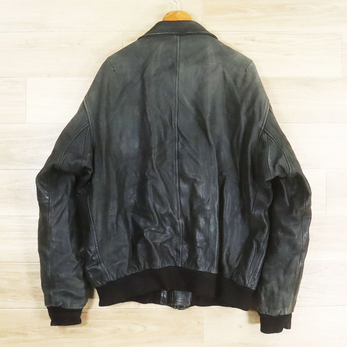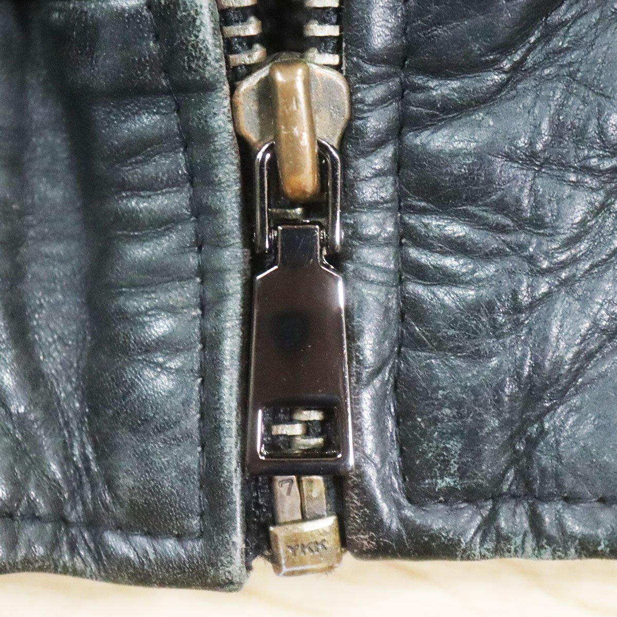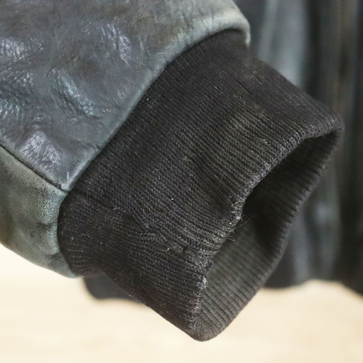 中古品です。使用感があります。袖や裏地など全体に経年によるレザー特有の擦れと色褪せ、袖リブにアタリと薄汚れ、裾リブに擦り切れ、フロントジッパー引手の付け替えがあります。