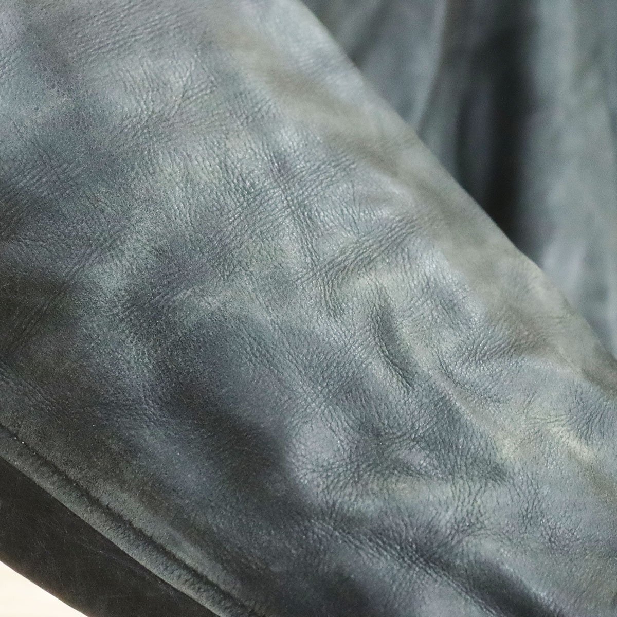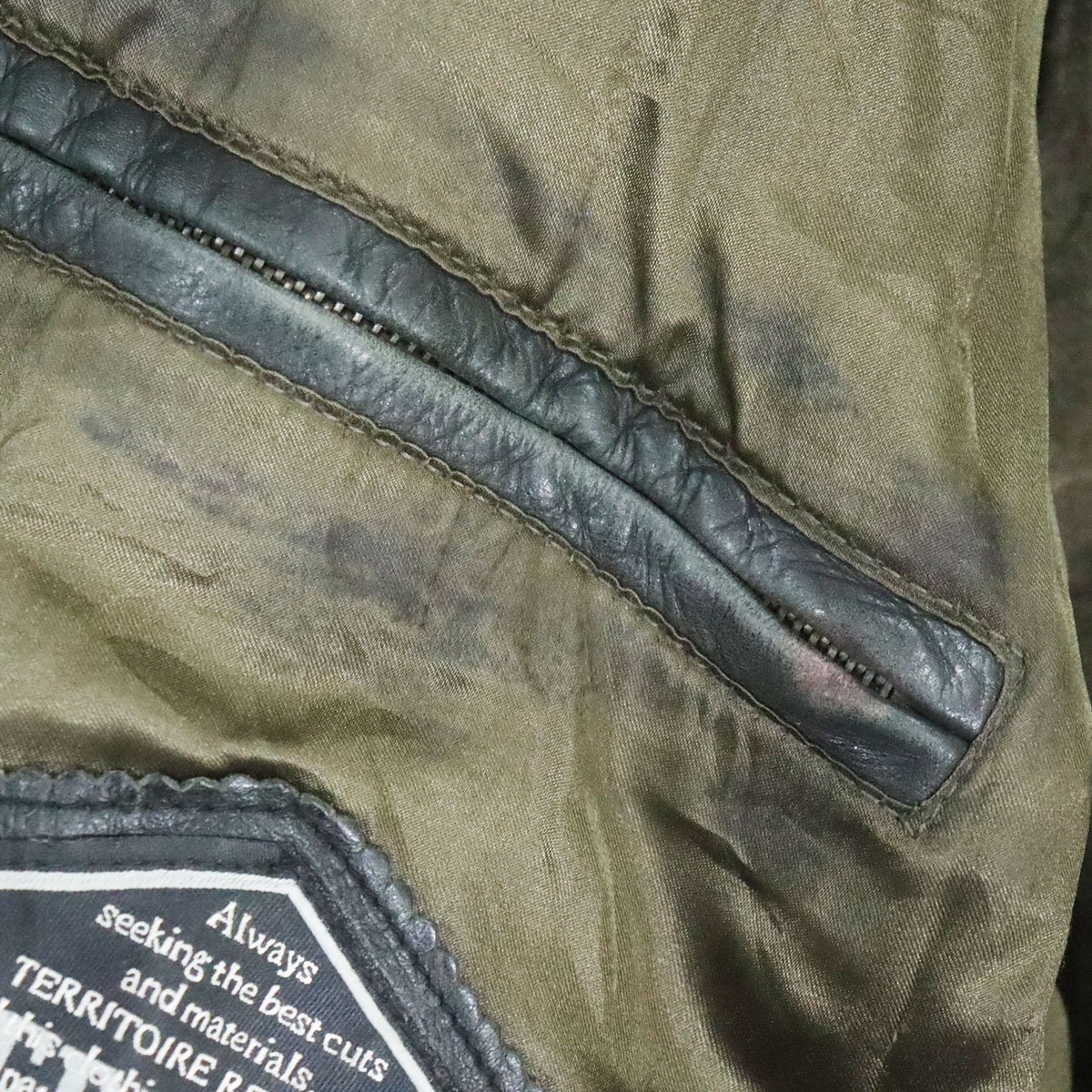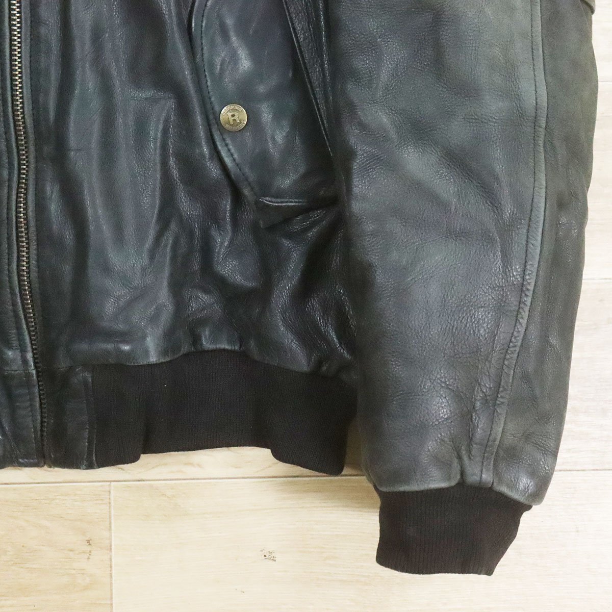 中古品です。使用感があります。袖や裏地など全体に経年によるレザー特有の擦れと色褪せ、袖リブにアタリと薄汚れ、裾リブに擦り切れ、フロントジッパー引手の付け替えがあります。