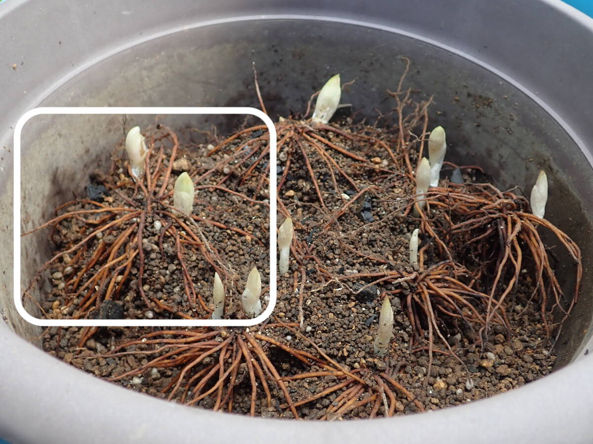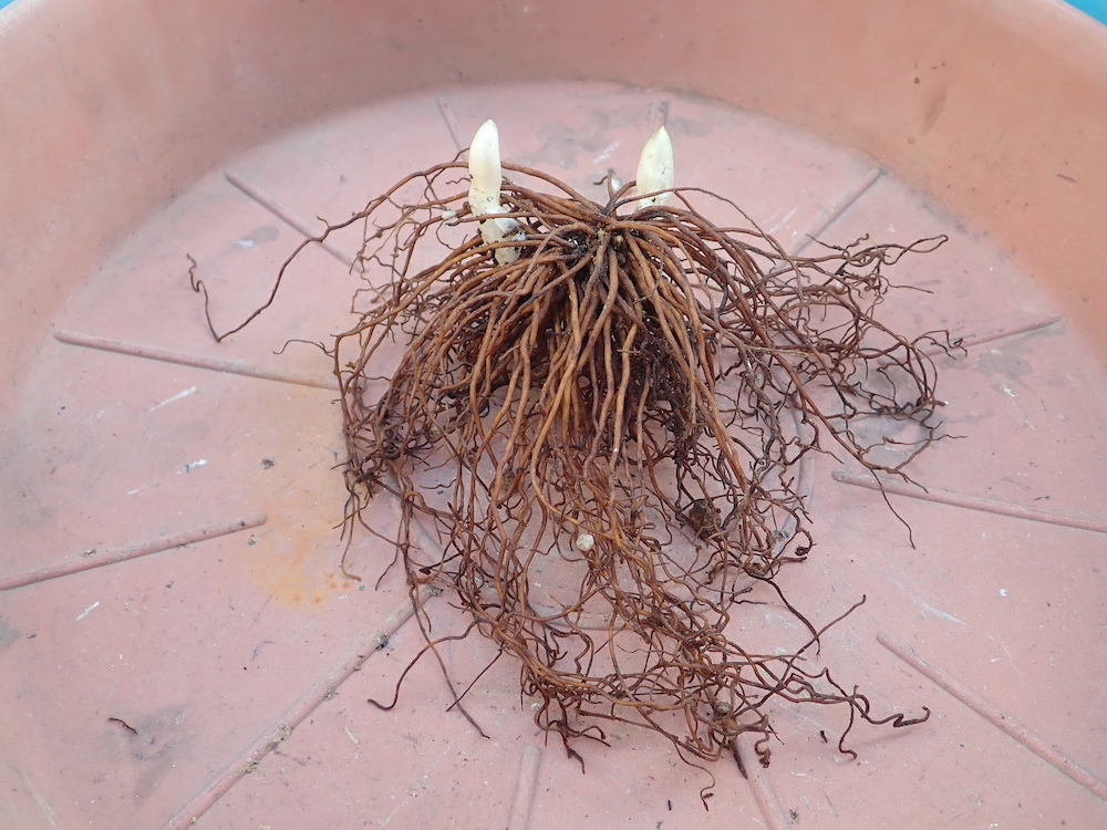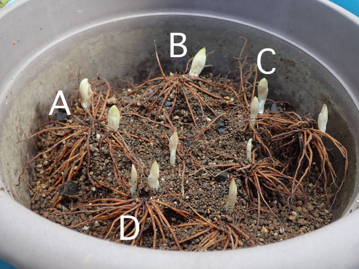 添付画像には鉢開けした時の様子と、出品の株を白い枠で覆い示しておきました。Aが4年目で2輪1株。Bが1輪1株。CとDは今年開花しませんでしたが来春は開花するであろう2芽1株。出品のための写真撮影後は、入札無く売れ残っても良いように鉢に植えて管理しています。落札者が現れましたら、掘り出して梱包し発送いたします。送料無料。発送方法は根の周りをパーミキュライトで覆って水苔を被せて、空きスペースは新聞紙で包んで梱包。60センチサイズの段ボール箱に入れてクロネコヤマトより発送します。 第四種郵便で発送すると一般の郵便物と同様に室内保管される為、蒸れる危険性があります(私=落札者としての過去の嫌な経験談。それを反面教師として段ボール箱を使用してます)。運送業社は荷物を倉庫管理&保管されるので、蒸れる危険性は下がります。