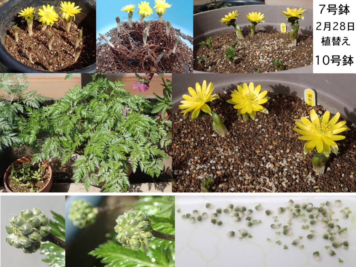 この「佐渡の幻の黄花」は通常種を付けませんが、ごく稀に気まぐれで種を付けます。今回私が出品する苗は2021年の種になります。いびつな実りでしたが、初めて種が付いたので植えてみたところ、翌春2022年では全ての種が発芽しました。驚いたのは発芽時期が通常の福寿草の発芽よりかなり早い時期に発芽したこと。生えた双葉が通常より二回りほど大きかった事。早く芽吹いたのに通常の福寿草の双葉が枯れてからも3週間以上生えていた事です。がぜん興味が惹かれた2023年2年目は、葉が茂り、茎の根元からは小さい葉も伸びているし、通常の福寿草の2年目とは思えない生長度合いでした。2024年の3年目は花が咲いていてもおかしくない葉の茂り具合でした。4年目となった今年2025年春に3輪開花しました(3輪とも種を付けました)。今まで菊鉢7号で栽培してきましたが想像以上に生長するので10号鉢へ植え替えしたところ、1芽1株で3輪開花したのではなく、実生から4年目初開花なのに2芽1株で開花した株があり驚きました。驚異的な生長です。4年目となった今年2025年11月15日(土)に鉢開けしたところ芽数が増え、根元には来年以降増える小さい芽が付いていました。他とは違う尋常ならざる生長&繁殖力を感じます。これ以上栽培している鉢数を増やしたくないので、今の内に譲渡すべく出品する次第です。