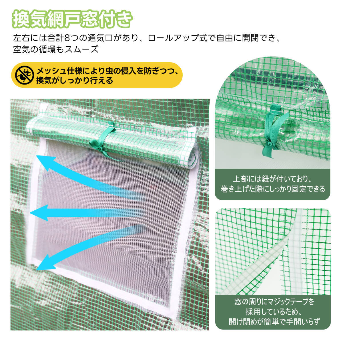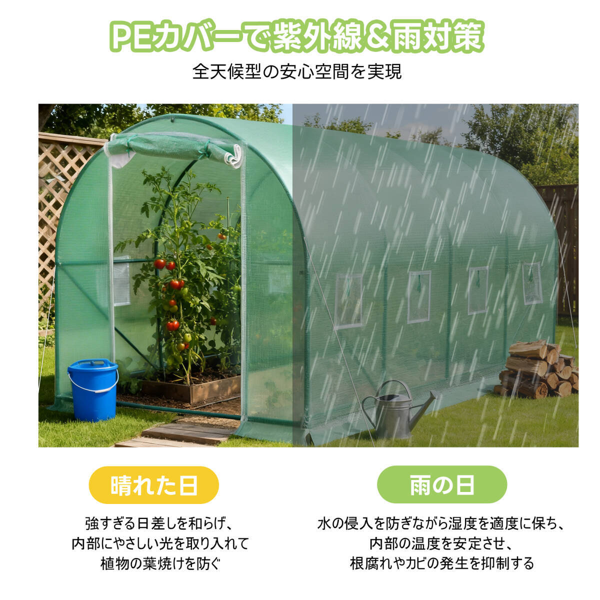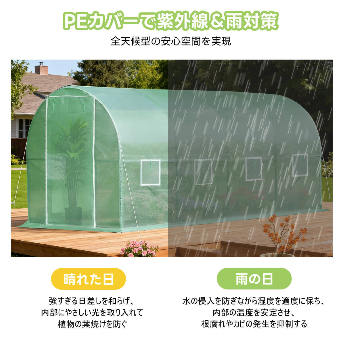 【全天候型PEカバーで植物を守る】紫外線を和らげるPE素材が強い日差しをカットしつつ、やさしい光を取り入れ葉焼けを防止、さらに雨水の侵入を防ぎながら湿度と温度を安定させ根腐れやカビの発生を抑えます。【広々設計で快適作業】236*486*180cmの大空間で立ったまま作業可能、家庭菜園や鉢の手入れも快適に行えます。【錆びにくく丈夫なスチールフレーム】頑丈な鉄製パイプ構造を採用し、屋外でも長く使える高い耐久性と安定性を実現しています。【出入りしやすいロールアップドア】前面ファスナー扉は巻き上げ式で大きく開き、作業効率アップ、マジックテープでしっかり固定できて便利です。【通気&防虫のメッシュ窓】左右8か所のロールアップ式通気口は虫を防ぎながら空気循環を促進、窓はマジックテープ付きで開閉も簡単です。