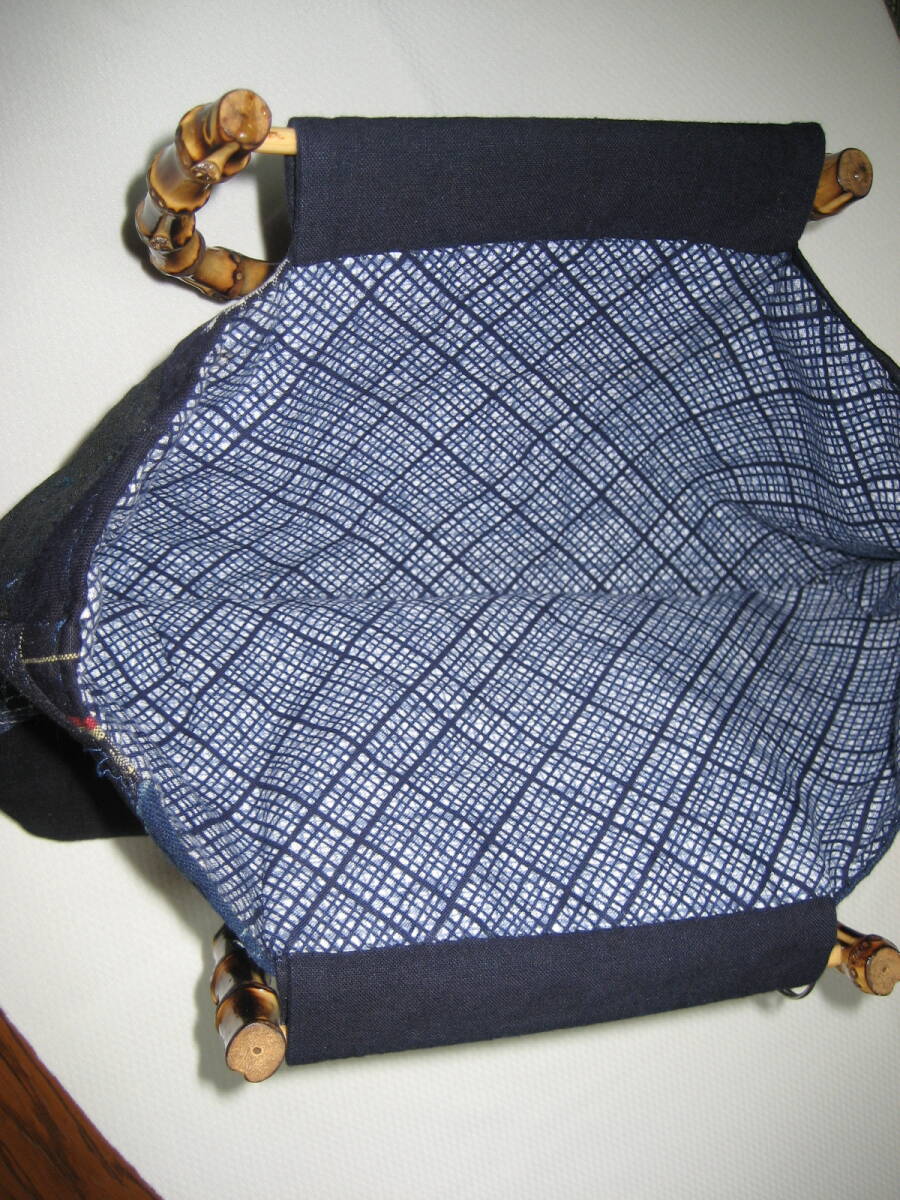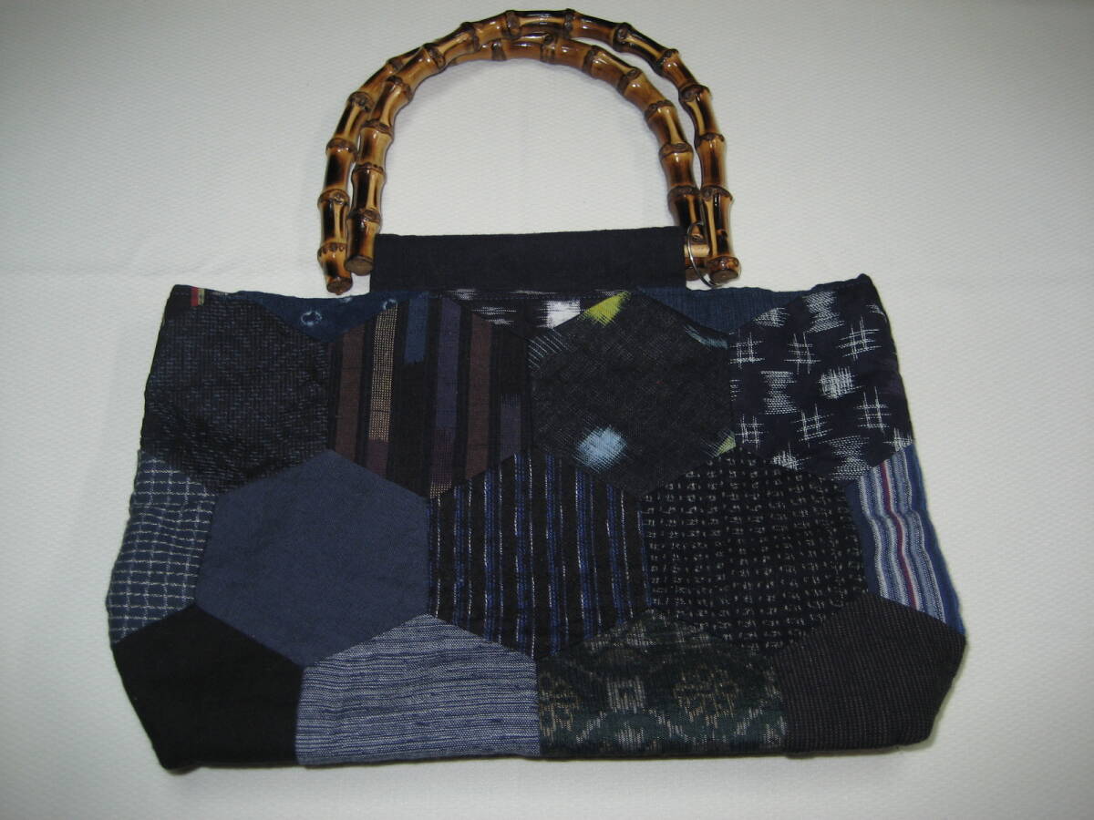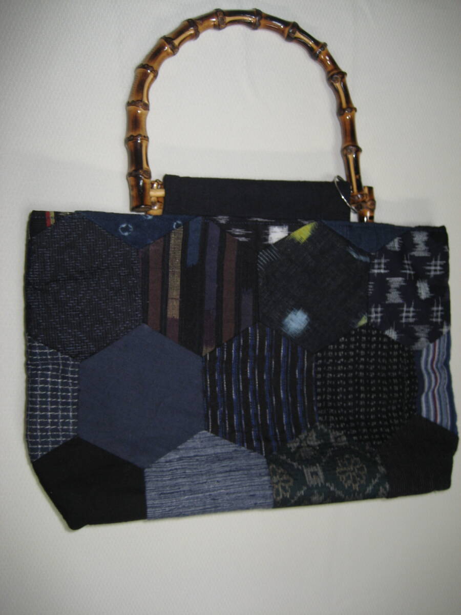 知人の手作り品です。かすりなどの古布を使い 持ち手は竹材のものを 使用しています。