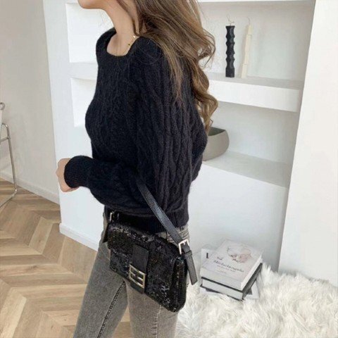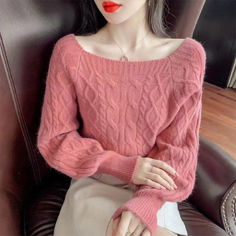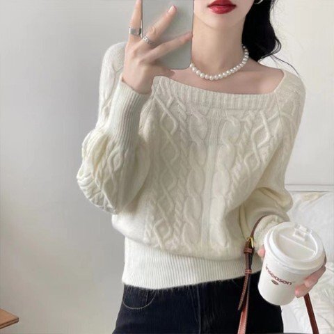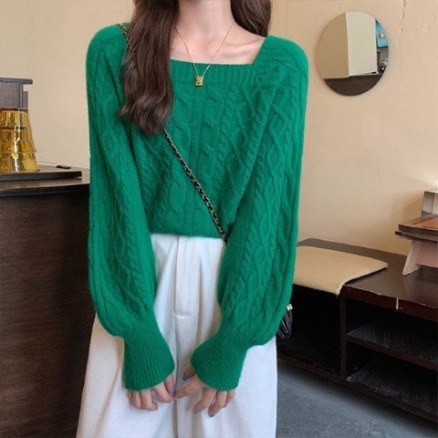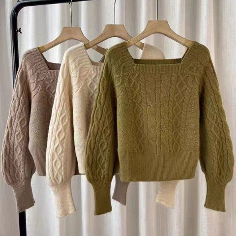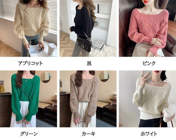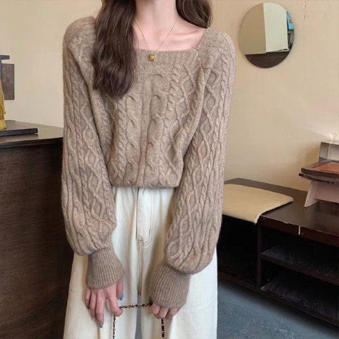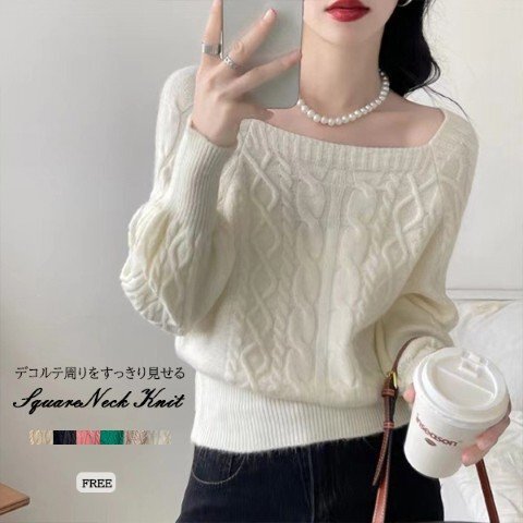 ・デコルテ周りをすっきりと見せ、首を長く見せる効果のあるスクエアネックニット。立体感のあるケーブル編みとショート丈感。