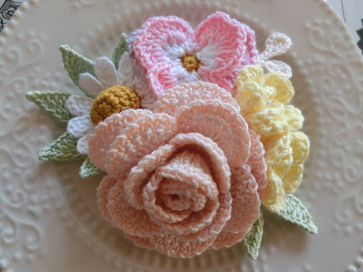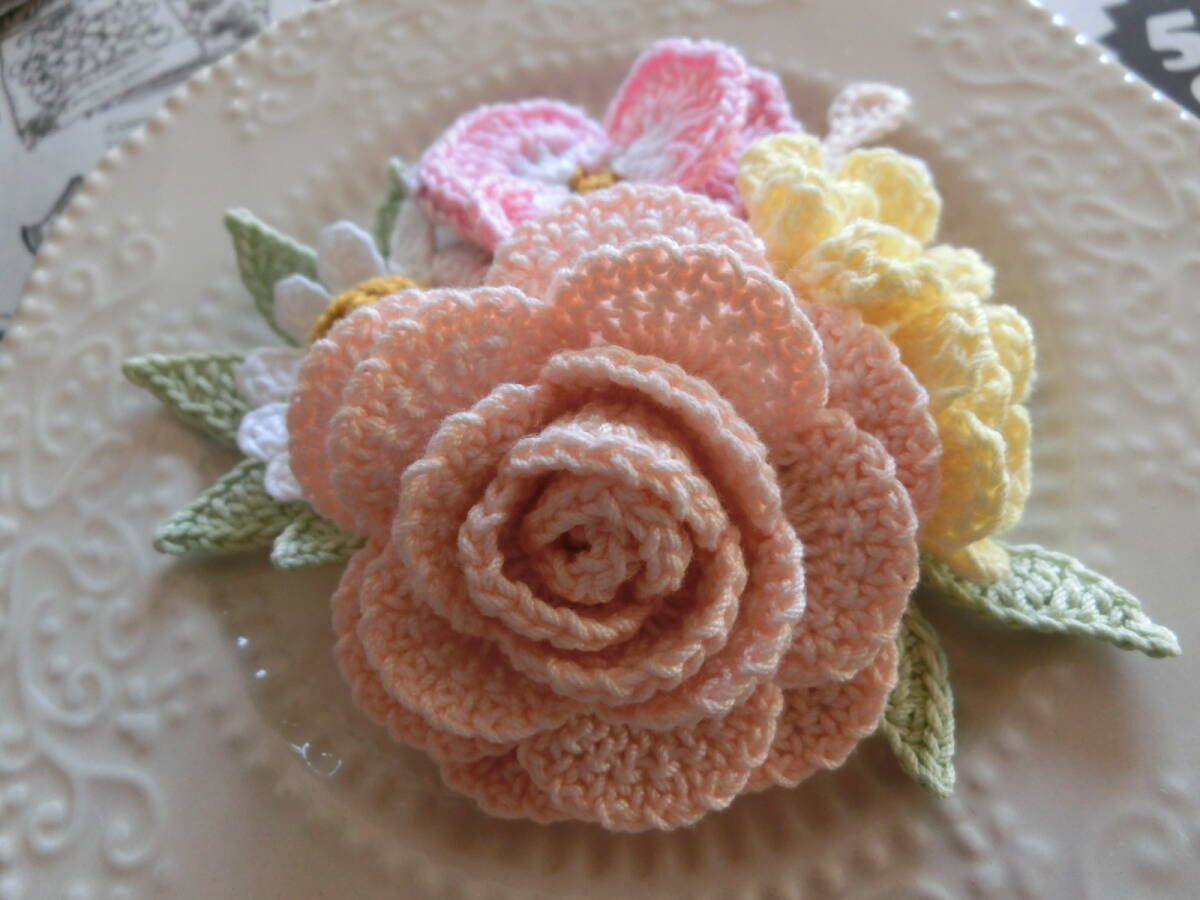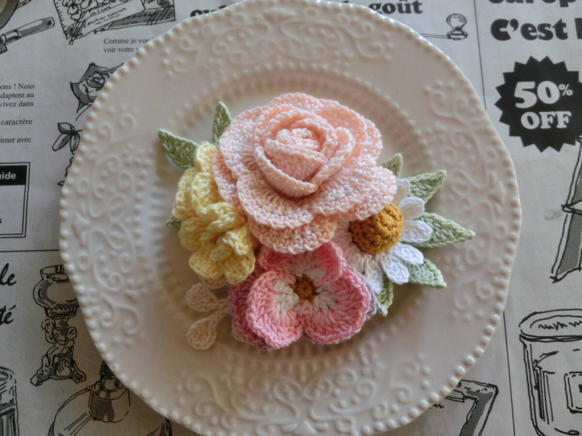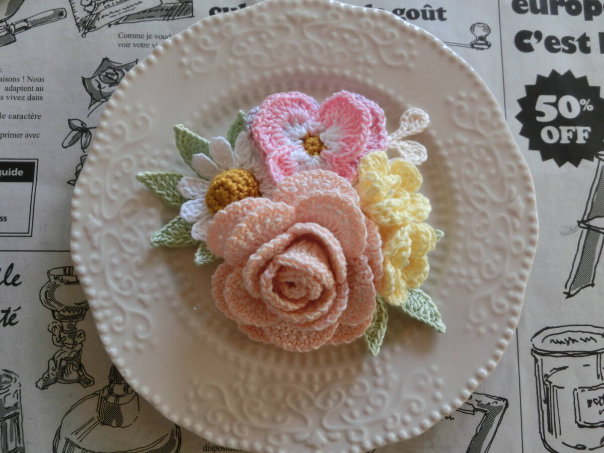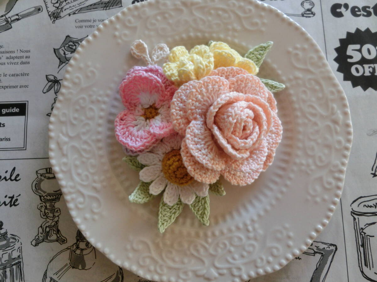 ☆ 2500  薔薇と小花のブーケ  ピーチピンク系薔薇  クロシェレース  コサージュ  ハンドメイド