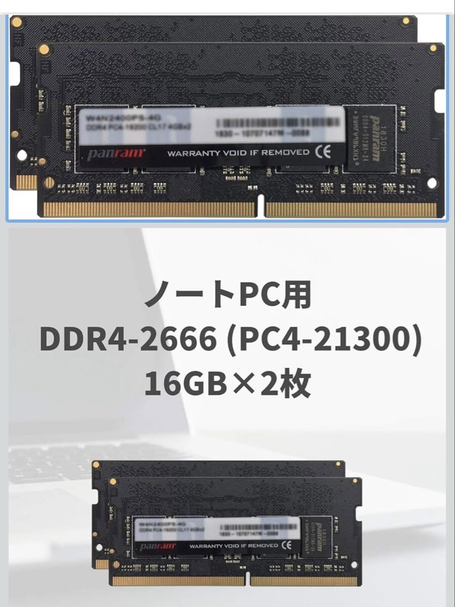 ノートPC用メモリ DDR4-2666 (PC4-21300) 16GB×2枚/合計32GB SO-DIMM の出品です。
