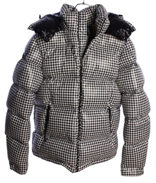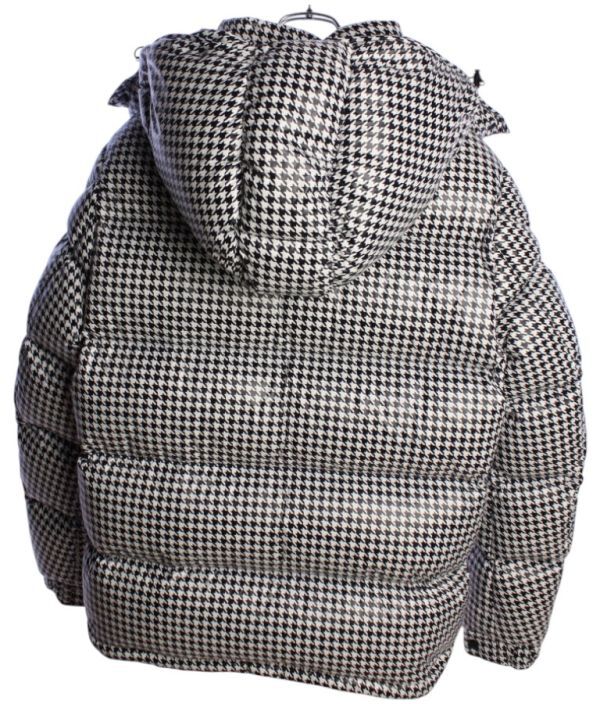 キルティング加工ナイロンタフタのダウンジャケット。撥水性あり。全体に千鳥格子柄のプリント。