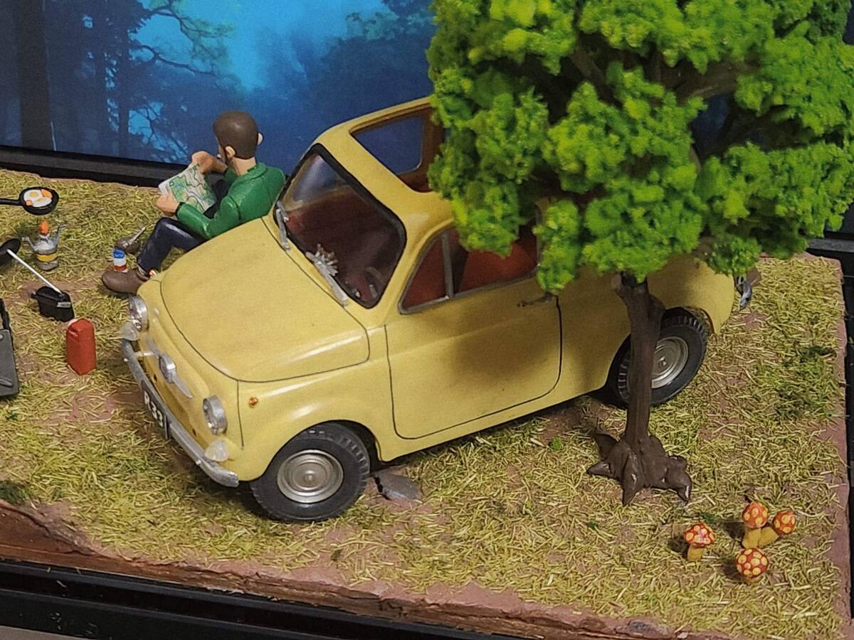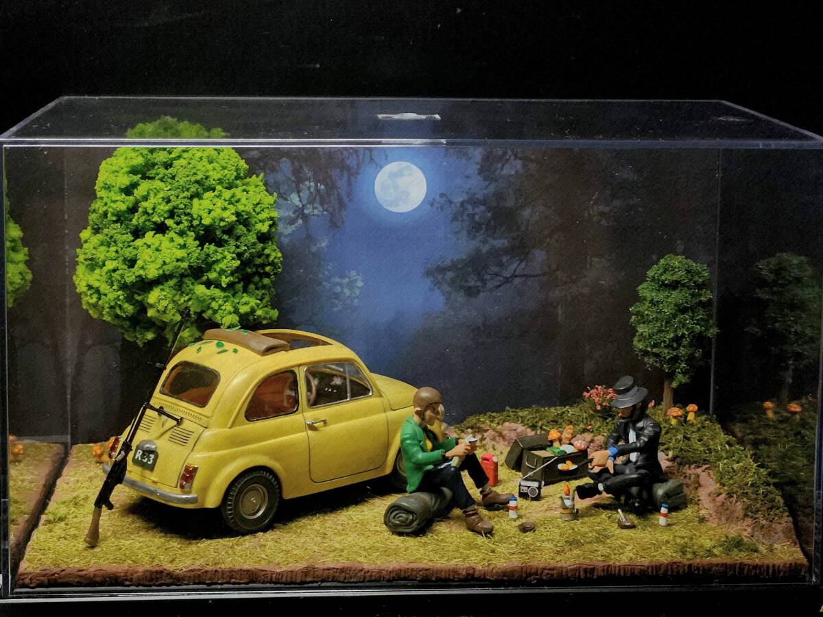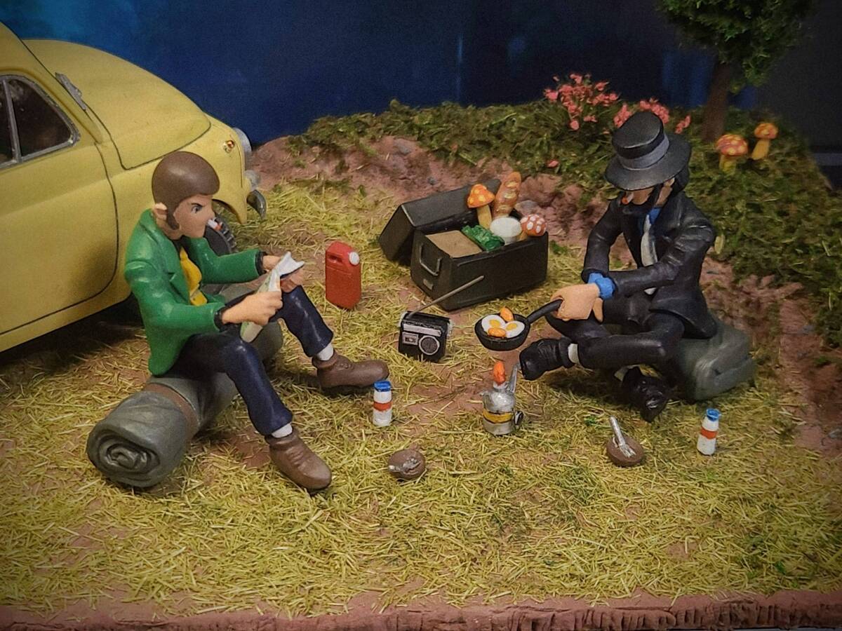 宮崎駿監督の名作「ルパン三世カリオストロの城」 オープニングで主題歌「炎のたからもの」が流れる中、カリオストロ公国へ向かうルパンと次元が途中で森で野営しているシーンをジオラマにしました。