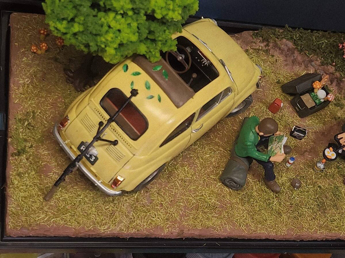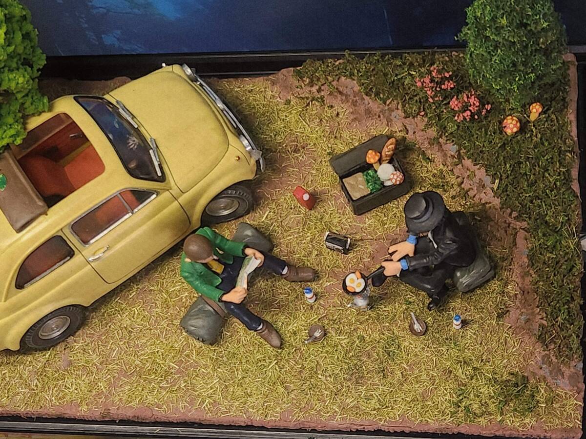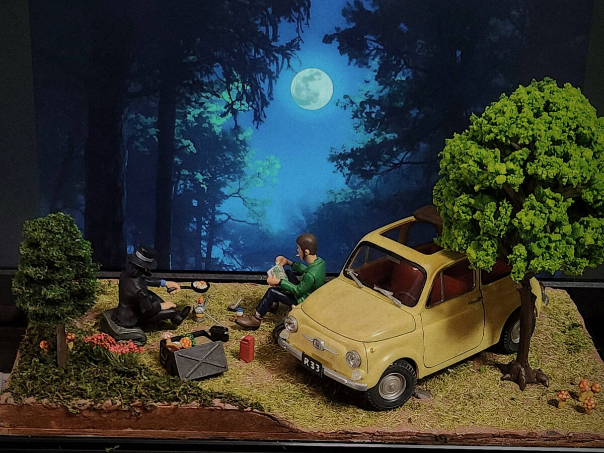 宮崎駿監督の名作「ルパン三世カリオストロの城」 オープニングで主題歌「炎のたからもの」が流れる中、カリオストロ公国へ向かうルパンと次元が途中で森で野営しているシーンをジオラマにしました。