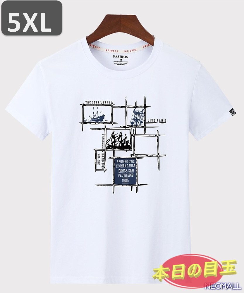本日のお買得 ☆ 丸首 半袖 Tシャツ【461】 ホワイト 5XLサイズ トップス シャツ シンプル イラスト デザイン 春夏