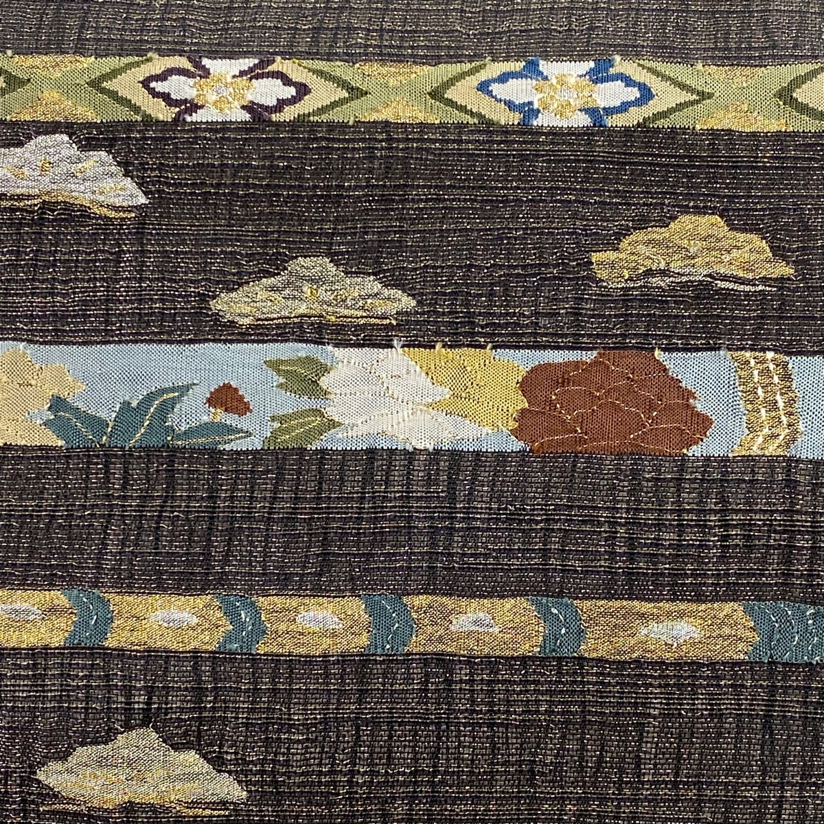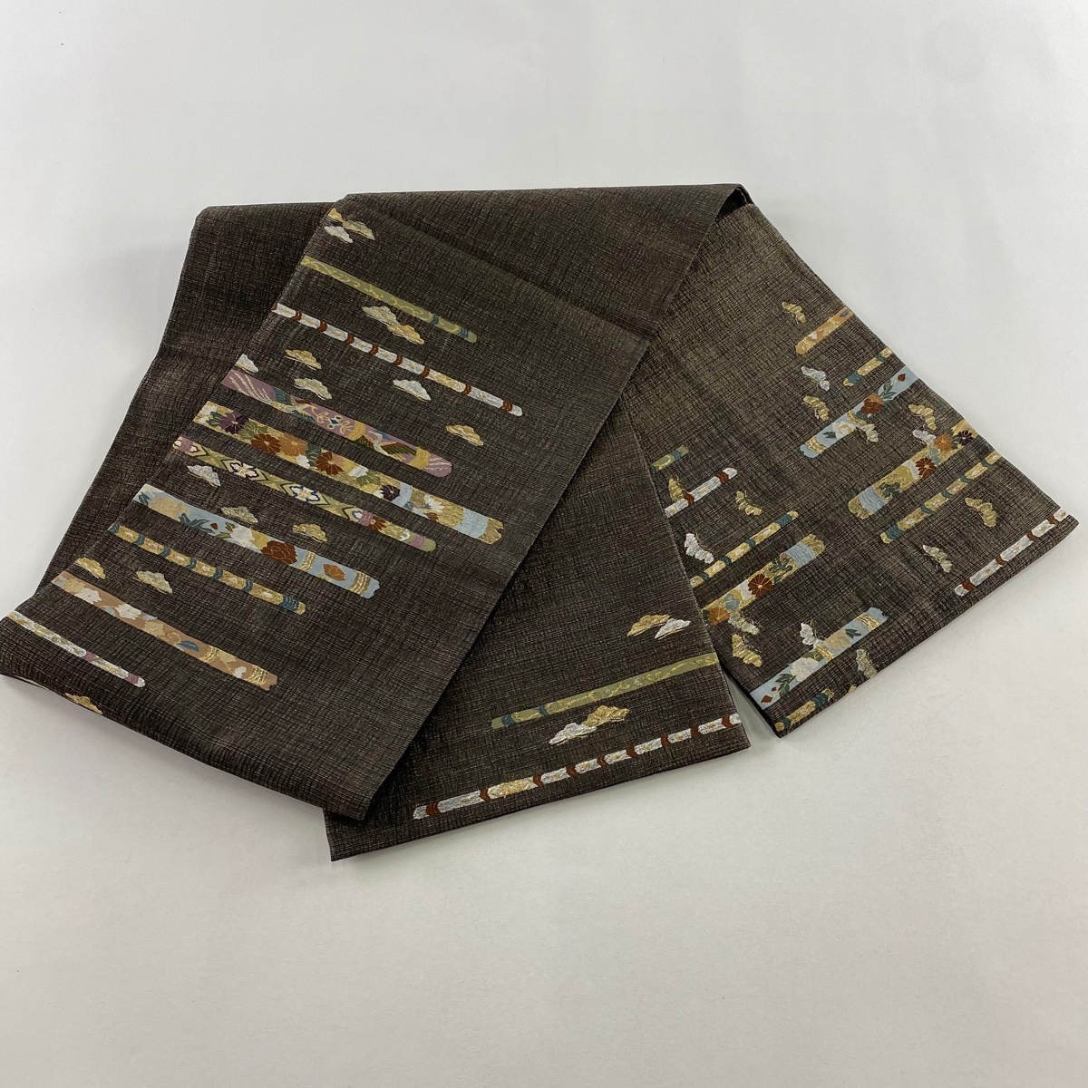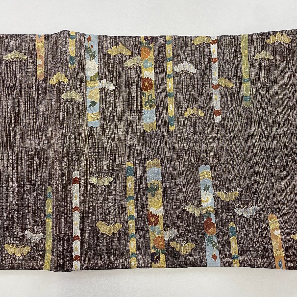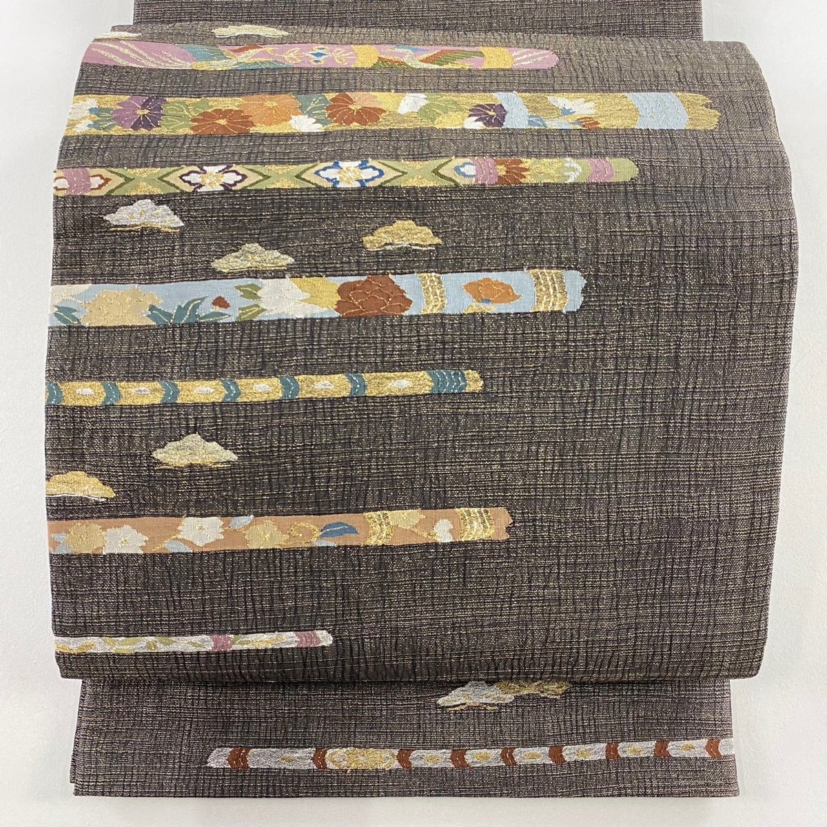 | 袋帯 名品 笛 花鳥 金銀糸 黒灰 お太鼓柄 正絹 【中古】 |