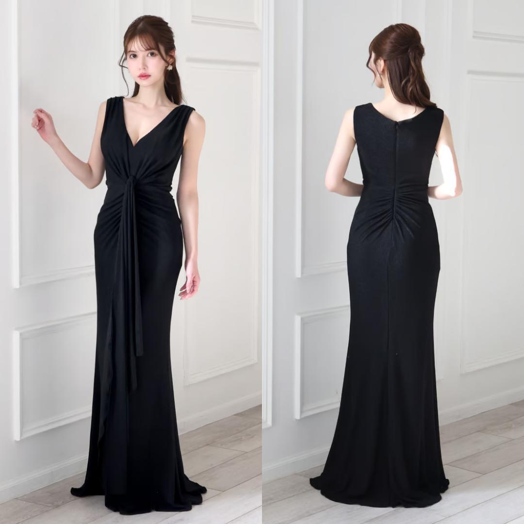 シンプル/ ラメニット/ ノースリーブ/ ギャザー/ Vネック/ ストレッチ/ ロングドレス/ キャバドレス