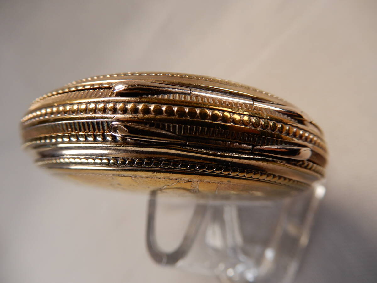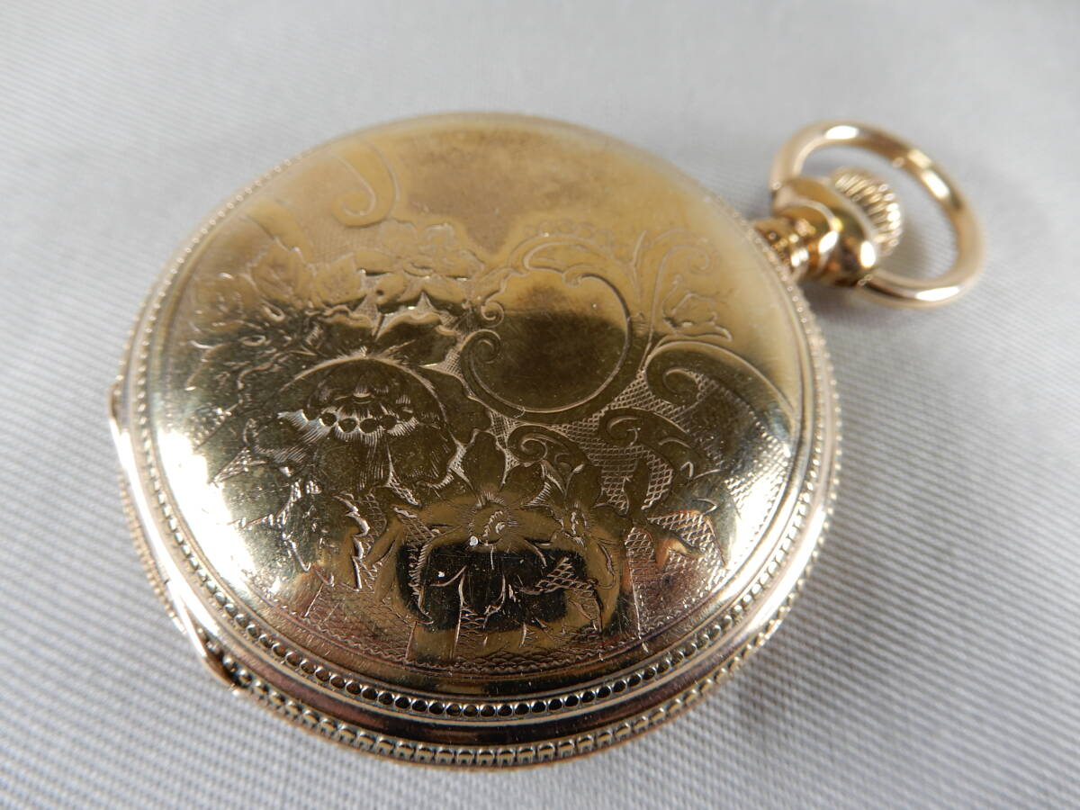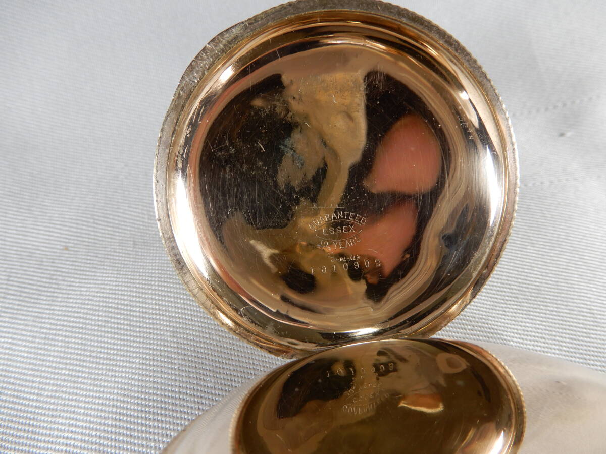 ケース:機械蓋が付いた金張りのフルハンターケースはESSEX製。金張りの剥がれもほとんどなく、経年による小傷程度で奇麗な状態だと思います。その裏表には奇麗な模様が施されています。竜頭を押すと表蓋はバネの力で90度に開き、またきちっと閉まります。ガラス風防にも気になるようなキズもなく奇麗な状態だと思います。ただし、いずれも個人的な主観になりますので、あくまで写真優先とし、写真でのご確認をお願いいたします。裏蓋の内側には「GUARANTEED ESSEX 10YEARS 1010902」の刻印があります。