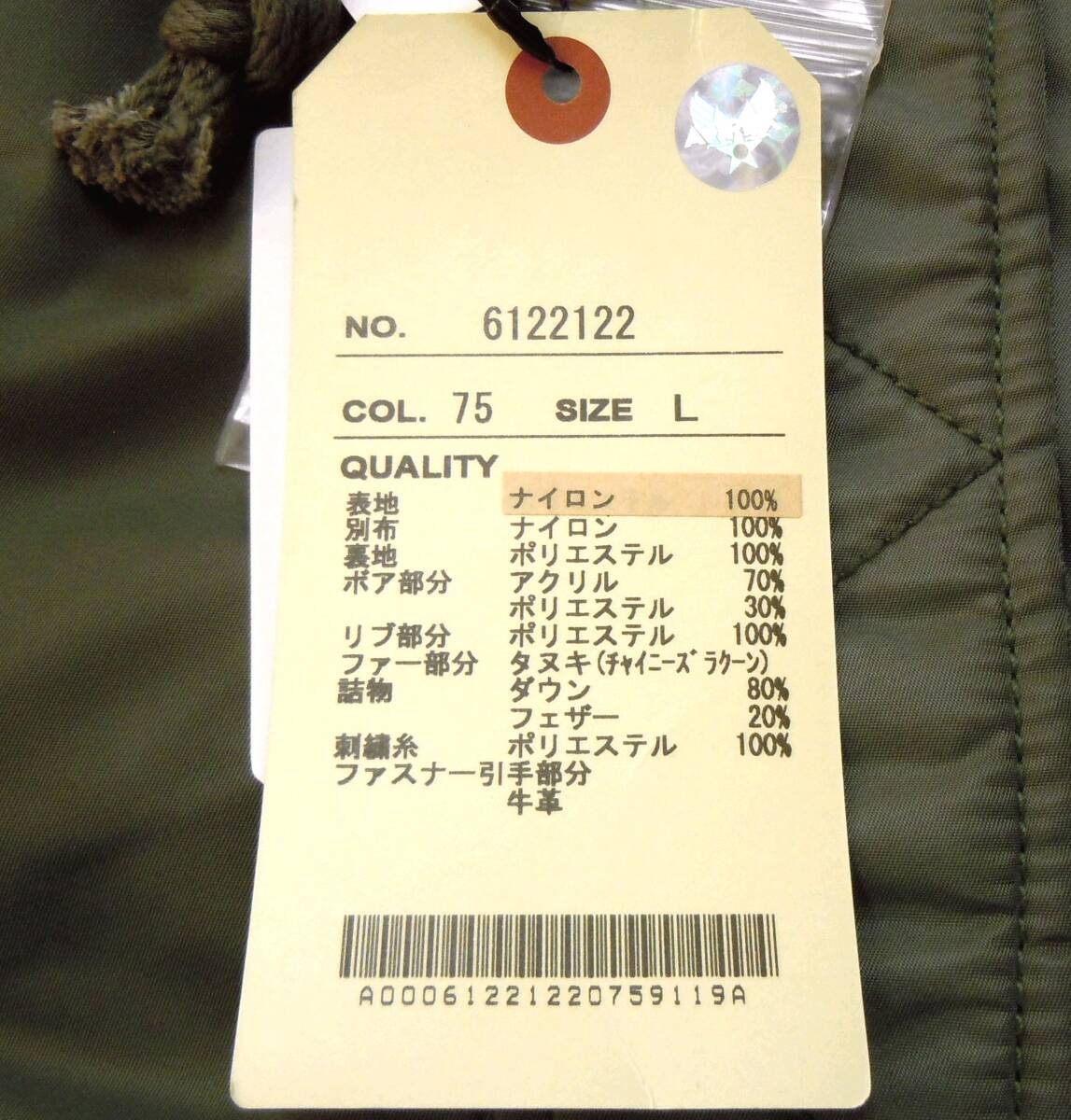 | 定価48,000円、カラーはオリーブ 、サイズ表記はメンズLです。(平置きサイズもご参照下さい) |