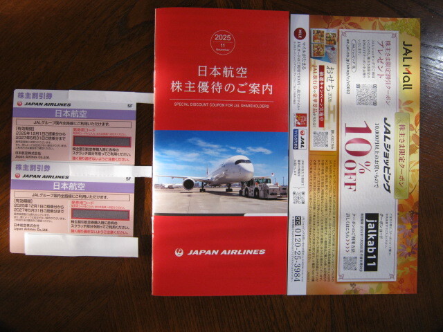 1 JAL 「株主割引券」 2枚及び「株主優待のご案内」1冊です。