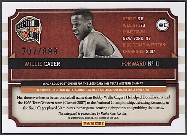 10-11 Panini Hall of Fame Famed Signatures #WC Willie Cager (707/899)になります。
