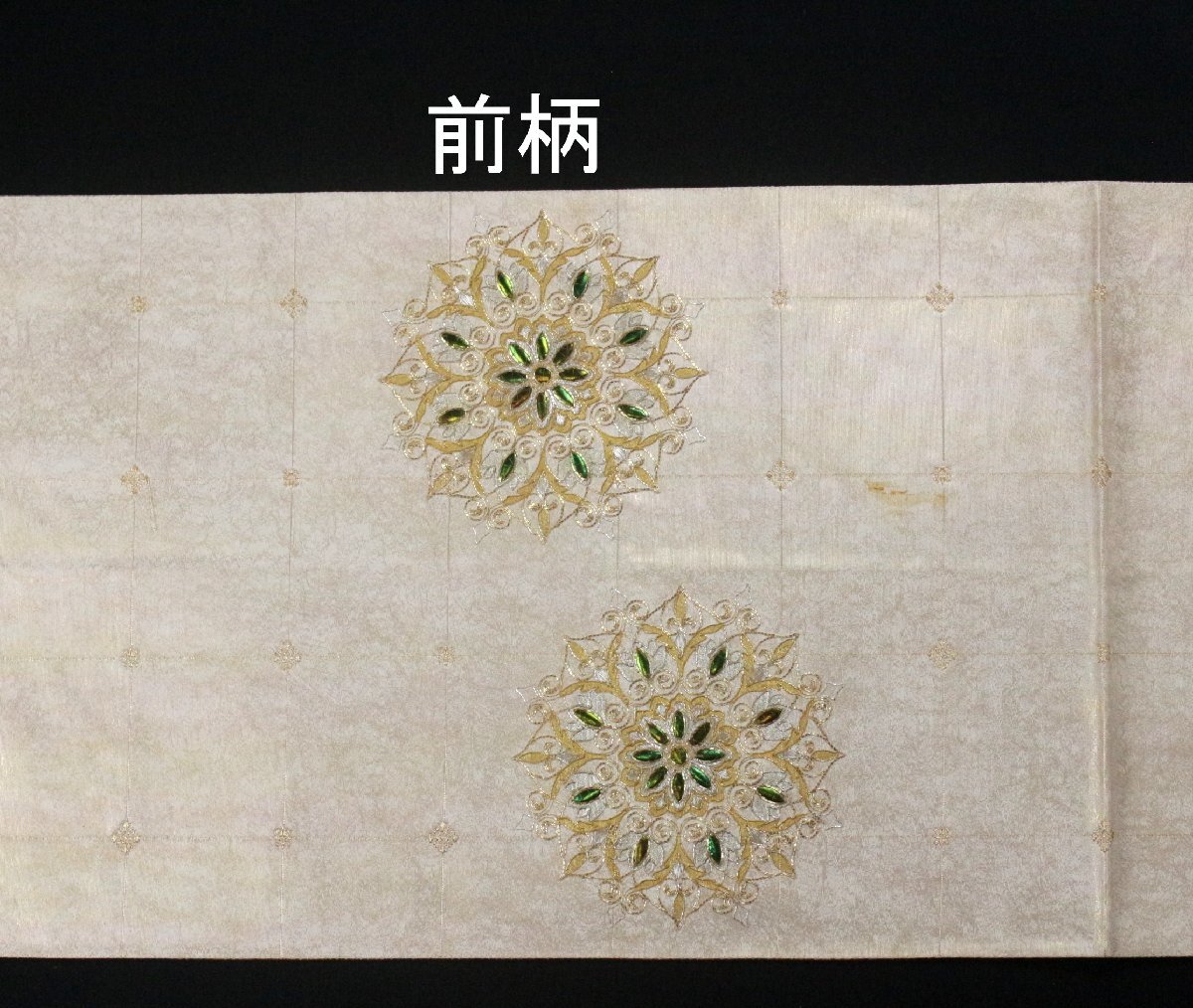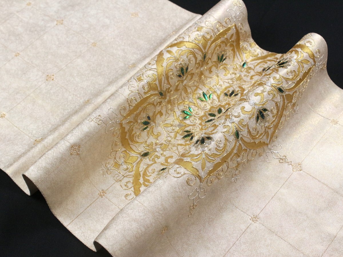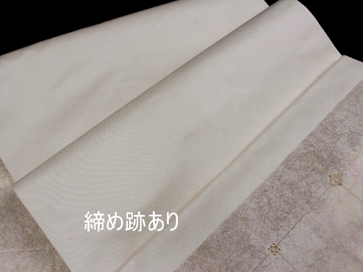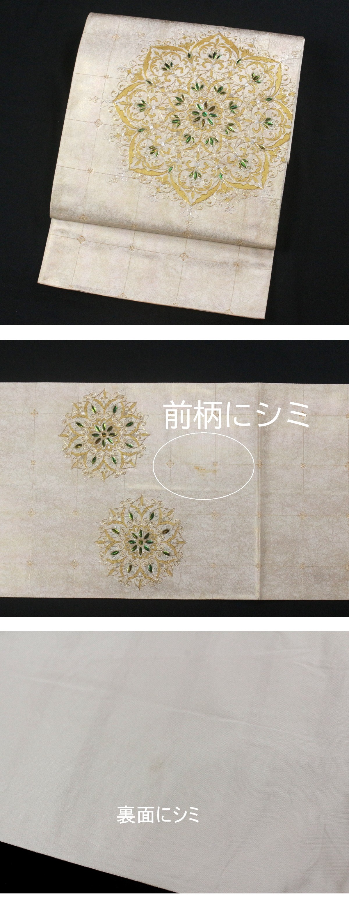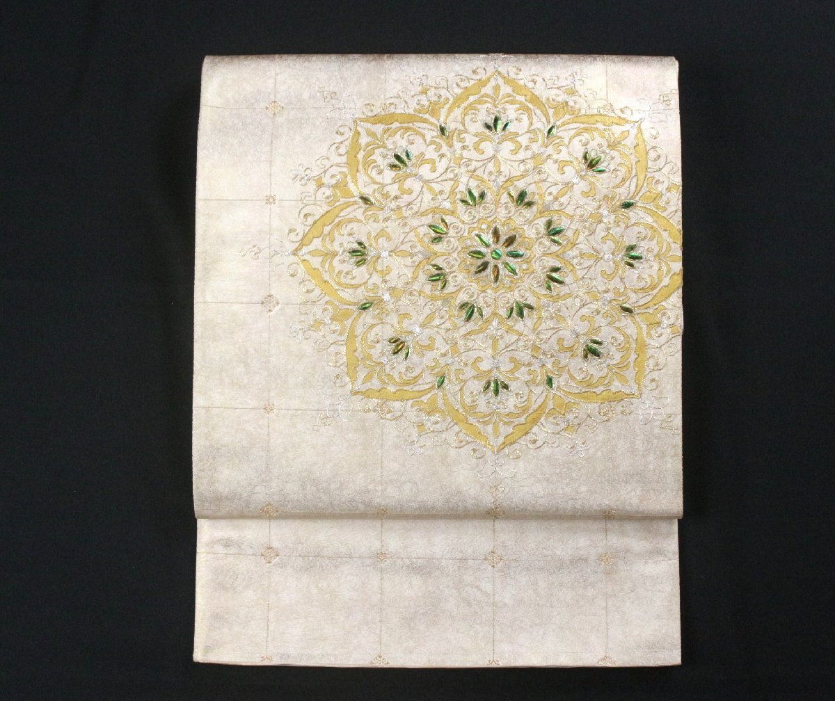 染めと織の先駆的クリエーター「じゅらく」の正絹袋帯のご紹介です。 上品な白金色の帯地に、大きく咲き誇る華文が玉虫色の光沢を伴って織り出され、格調高い華やかさを演出。 金糸の煌めきと、角度によって変化する玉虫色の輝きが重なり合い、奥行きのある美を帯全体に宿しています。 「玉虫貴人(たまむしきじん)」とは、西陣じゅらくが誇る高級帯地のシリーズ名で、光の角度により玉虫の羽のように色彩が変化する独自の織技法を指します。玉虫の羽根のような虹色の光沢は気品と神秘性を帯び、貴人=高貴な存在を想起させることから、この名が付けられました。まさに西陣織の粋を集めた逸品です。 正統派の華文は吉祥の象徴とされ、慶事や式典など格式ある場面にふさわしい意匠で、晴れやかな装いに重厚な華を添えてくれます。 お目に留まりましたら、是非ご検討下さいませ。 ※撮影時の部屋の照明によって画像の色に若干の差がございます。色味に差がございますことをご了承のうえご検討下さいませ。 …状態… 締め跡。所々にシミあり。 ※全くの新品ではございませんので、記載のない変色やスレ、ヤケ、その他僅かな難がある場合がございます。そのような理由でのキャンセルはお受けできませんので、ご了承の上ご検討お願いいたします。 |