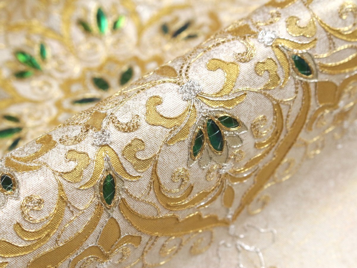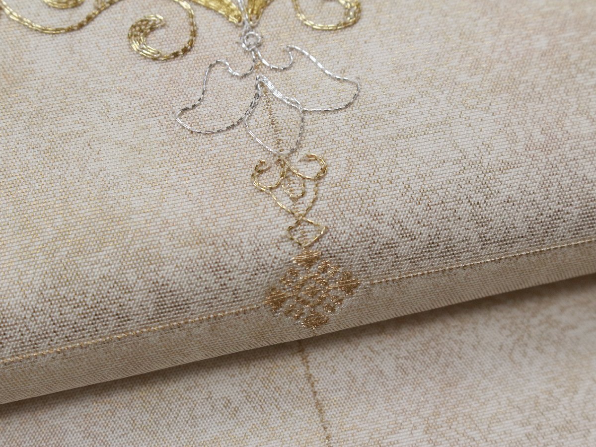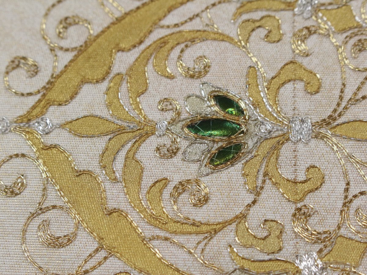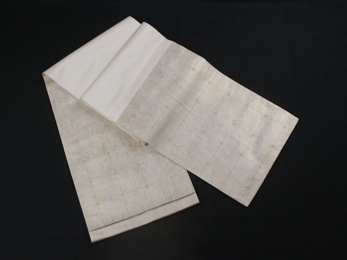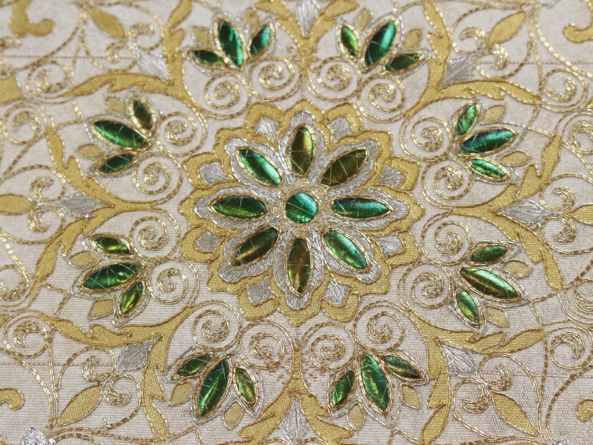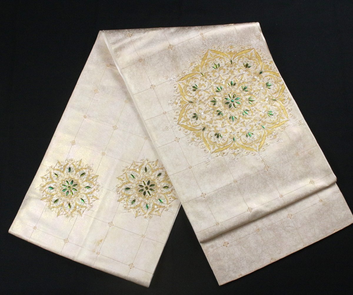 染めと織の先駆的クリエーター「じゅらく」の正絹袋帯のご紹介です。 上品な白金色の帯地に、大きく咲き誇る華文が玉虫色の光沢を伴って織り出され、格調高い華やかさを演出。 金糸の煌めきと、角度によって変化する玉虫色の輝きが重なり合い、奥行きのある美を帯全体に宿しています。 「玉虫貴人(たまむしきじん)」とは、西陣じゅらくが誇る高級帯地のシリーズ名で、光の角度により玉虫の羽のように色彩が変化する独自の織技法を指します。玉虫の羽根のような虹色の光沢は気品と神秘性を帯び、貴人=高貴な存在を想起させることから、この名が付けられました。まさに西陣織の粋を集めた逸品です。 正統派の華文は吉祥の象徴とされ、慶事や式典など格式ある場面にふさわしい意匠で、晴れやかな装いに重厚な華を添えてくれます。 お目に留まりましたら、是非ご検討下さいませ。 ※撮影時の部屋の照明によって画像の色に若干の差がございます。色味に差がございますことをご了承のうえご検討下さいませ。 …状態… 締め跡。所々にシミあり。 ※全くの新品ではございませんので、記載のない変色やスレ、ヤケ、その他僅かな難がある場合がございます。そのような理由でのキャンセルはお受けできませんので、ご了承の上ご検討お願いいたします。 |