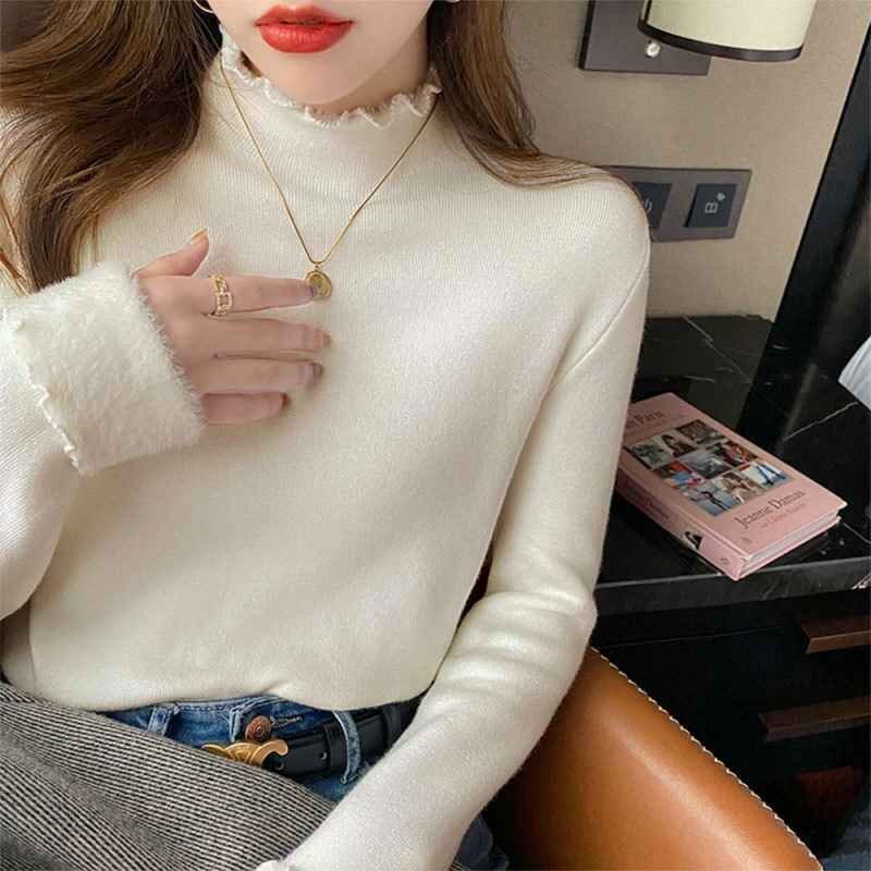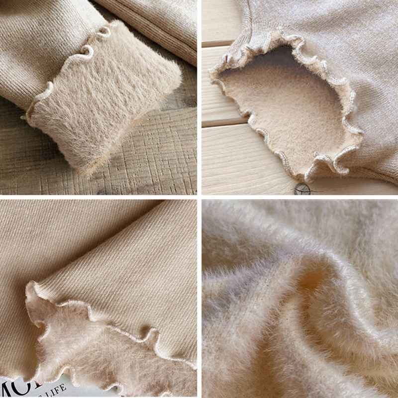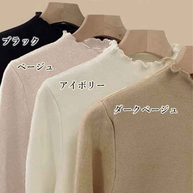 裏面はふんわり柔らかい肌当たりの起毛生地で、熱を逃がさず内側から温もりを与えてくれるハイネックニットトップス