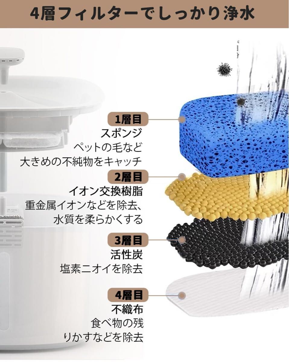 【四重濾過システム】四重濾過活性炭フィルターはマグネシウム、カルシウム、塩素、匂い、雑菌を取り除き、皮毛、食べ残し、ほこりを分離し、循環の水中に菌の増殖を防ぎ、循環的に新鮮な甘い流れ水を提供して、ペットがいつでも新鮮な水を飲めます。常に水を新鮮で清潔に保ち、ペットは健康を享受し、幸せに成長します。