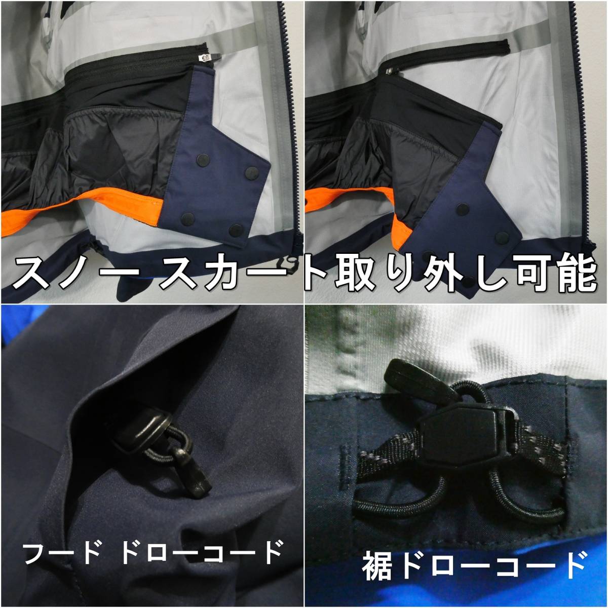 ・耐風性と防水性に優れた3レイヤー Pro素材 ・耐水圧:20,000 mm ・ヘルメットに対応できるフード ・1点調整システム付きのフード ・防水性Aquaguardフロントジッパー ・防滴ジッパー付き胸ポケット1つ ・撥水性ジッパー付きサイドポケット2つ ・面ファスナー付きプレシェイプスリーブ ・スキーパス用リストポケット1つ ・快適で伸縮性のあるハンドゲイター ・フラップの下の2-way ジッパーによる脇下のベンチレーション ・ジッパー付き内ポケット1つ ・伸縮性メッシュ素材の内ポケット ・しっかりと固定できるデザインの取り外し可能なスノースカート、個人に合わせて調節可 能なダブルボタン付 ・ジャケットをパンツに取り付けできるスノースカートのスナップボタン ・調節可能なヘム ・縫製パターン:Ski Regular ・重量785g(メーカー値になりますのでサイズによって重さが変わる事がございます) |