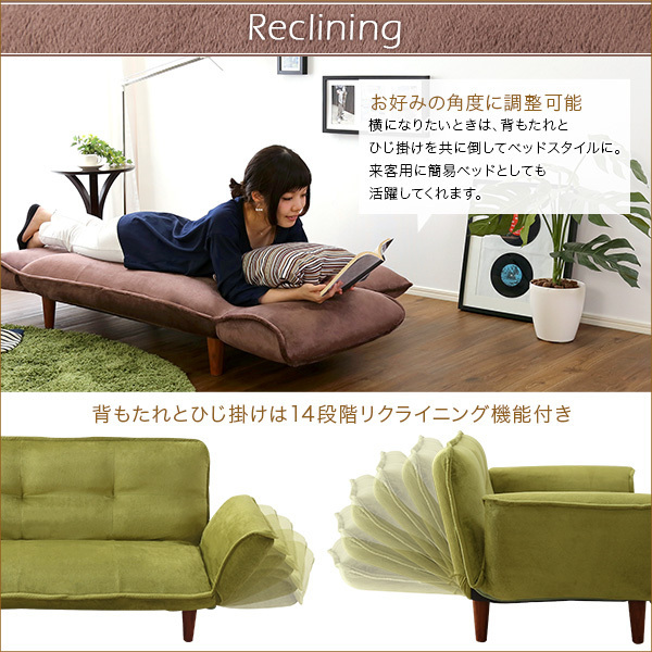 【ポイント】 ワンルームにちょうどいい、2人掛けリクライニングソファです。 肌触りがよく、華やかな起毛素材の風合いで温もりのあるお部屋に! 背もたれとひじ掛けは14段階リクライニング&安心の日本製です。 脚を取り外せばこたつにもピッタリなロースタイルにも。 お部屋を彩る4カラーがございます。 |