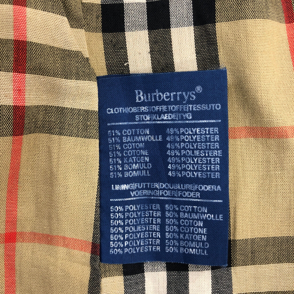 | 【商品管理番号】 R0028 【ブランド】 Burberrys/バーバリーズ 【サイズ】 42 L 【実寸サイズ】 着丈:約124cm 身幅:約62cm 裄丈:約85cm 袖下丈:約45cm 【主な素材】 表地 : コットン 裏地 : 13791 【色】 ベージュ 【仕様】 90年代 トレンチ 【状態】 汚れ:袖、袖先、胸、腹部、裾 キズ:背中、腰、裾 特記事項:使用感あり 首元ボタン欠損 | |||