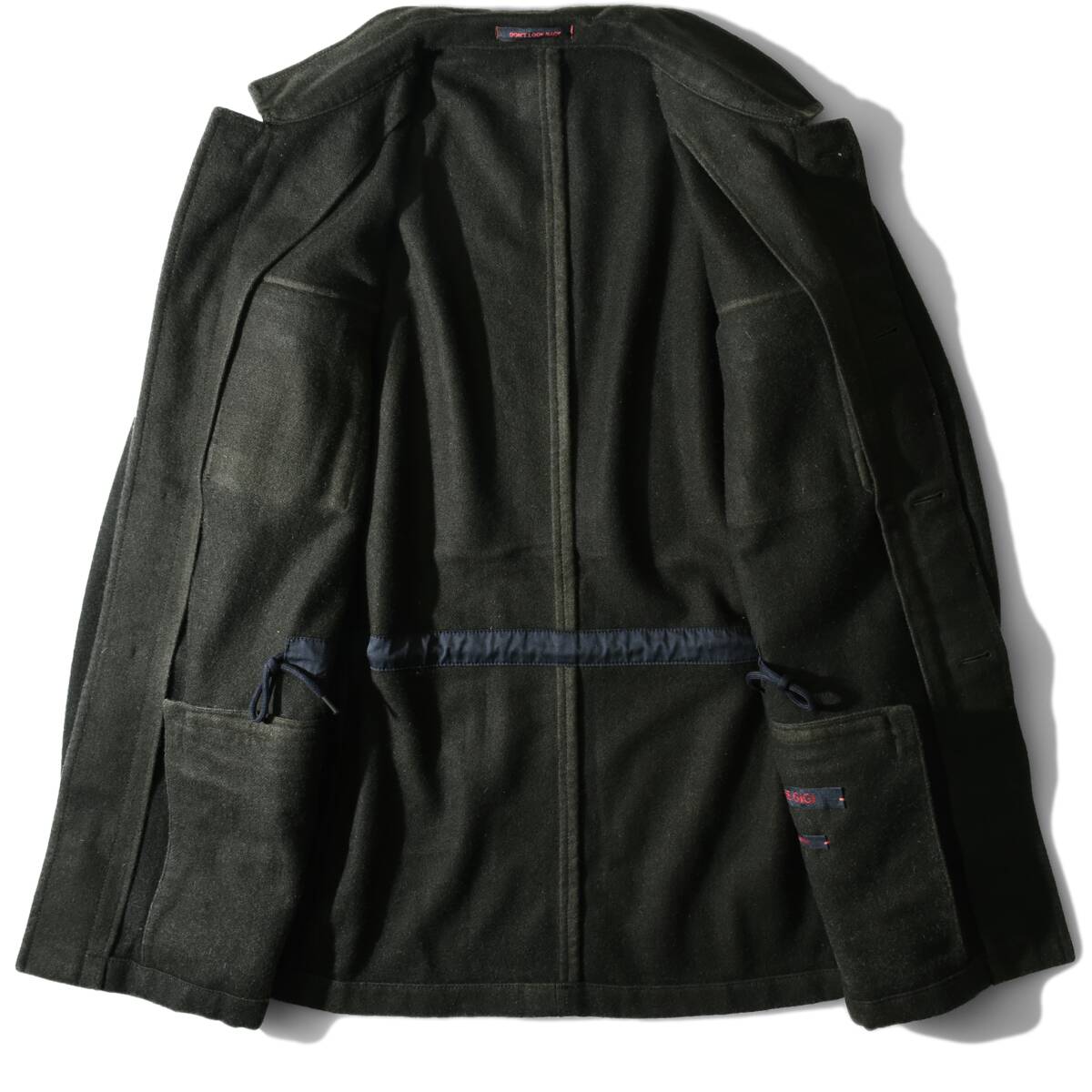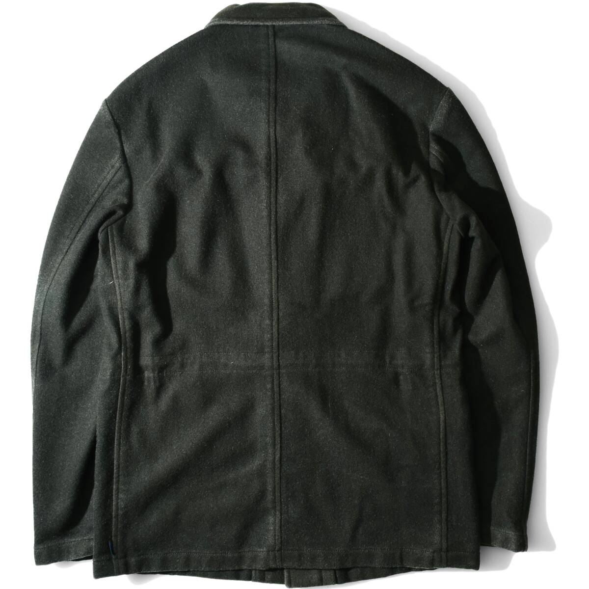 使用されている生地は、トップクオリティの「ヴァージンウール」に、「ナイロン」を混紡した 中番手紡毛糸を密に織り上げた後、縮絨(フェルト化)することで厚みを出して防寒性を高めた“ライトメルトン”になります。