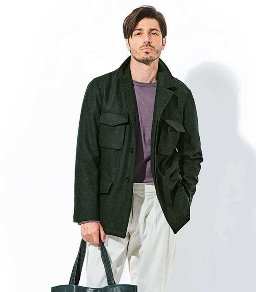 ミリタリーテイストは、ことオトコのカジュアルスタイルに欠かせません。 サッパリとシンプルな装いになる時期、デコラティブかつ、機能的なポケット郡によって、心許なさを払拭。 男らしさを醸すのでサラッと羽織るだけでサマになる便利さが最高のウリ!そして上質なウール素材は、 大人らしさを主張するのには必須。その二つの要素をマッチさせたのが本作。