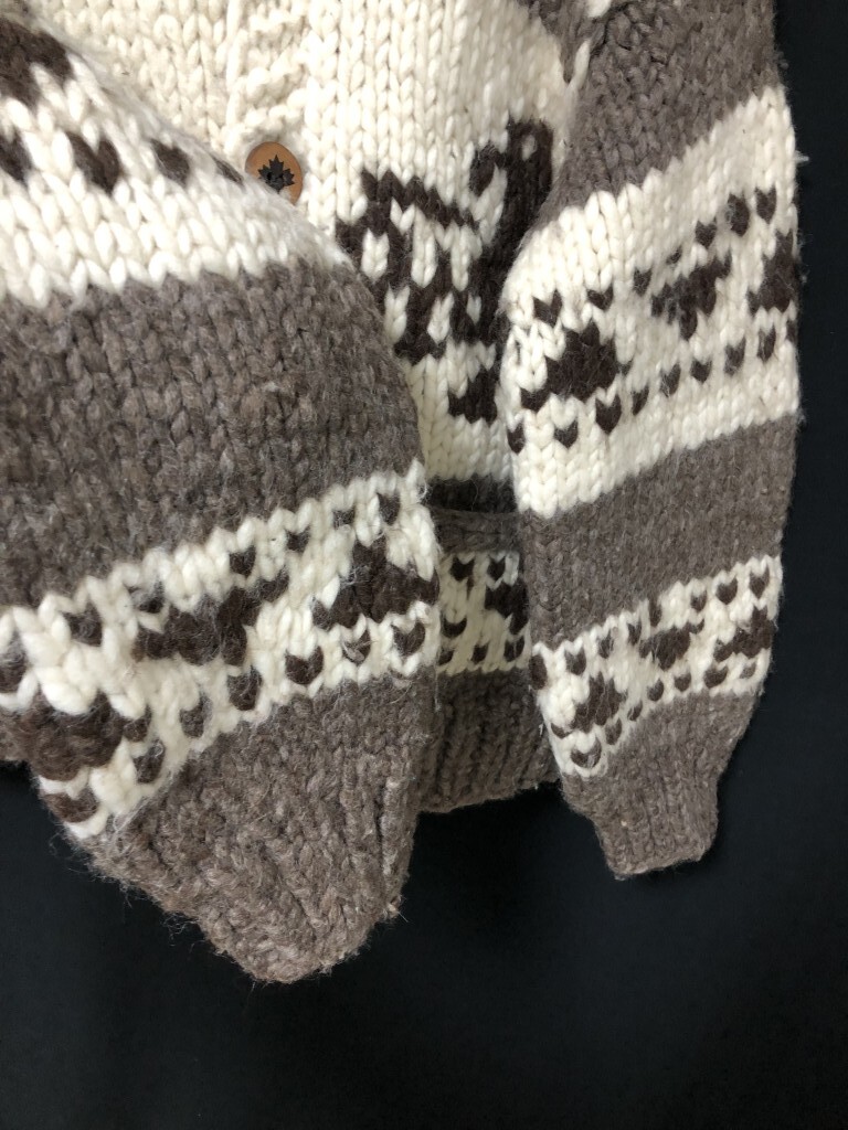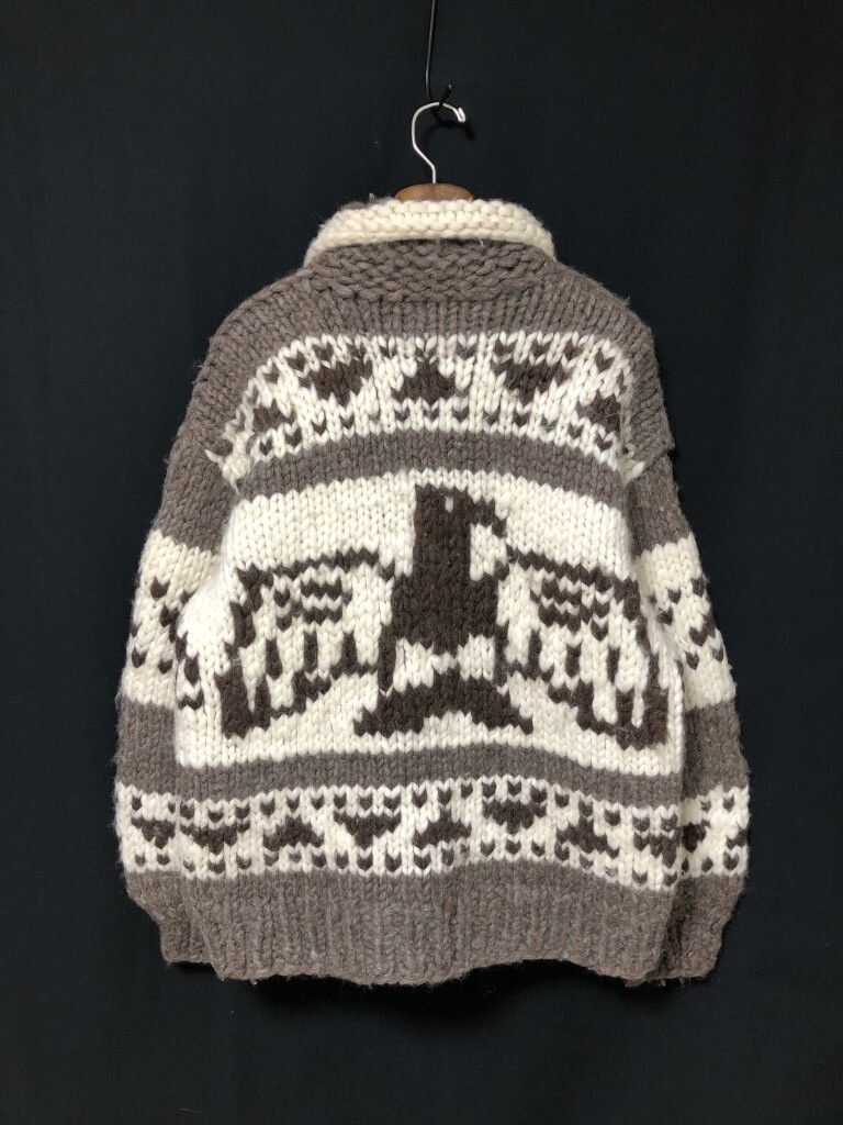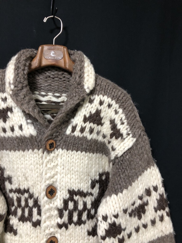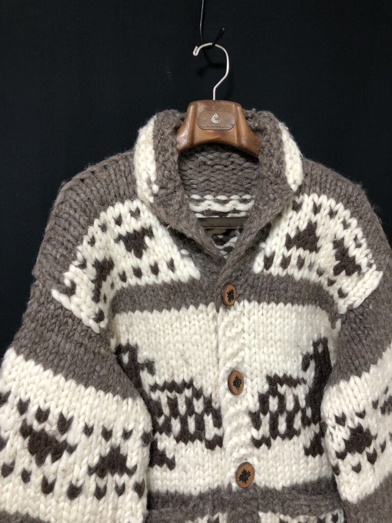 カナダ製◆カウチンプロダクツ カウチンセーター 肉厚本格モデル ウッドボタン CA07842 オフホワイト×茶 サンダーバード柄 雷鳥