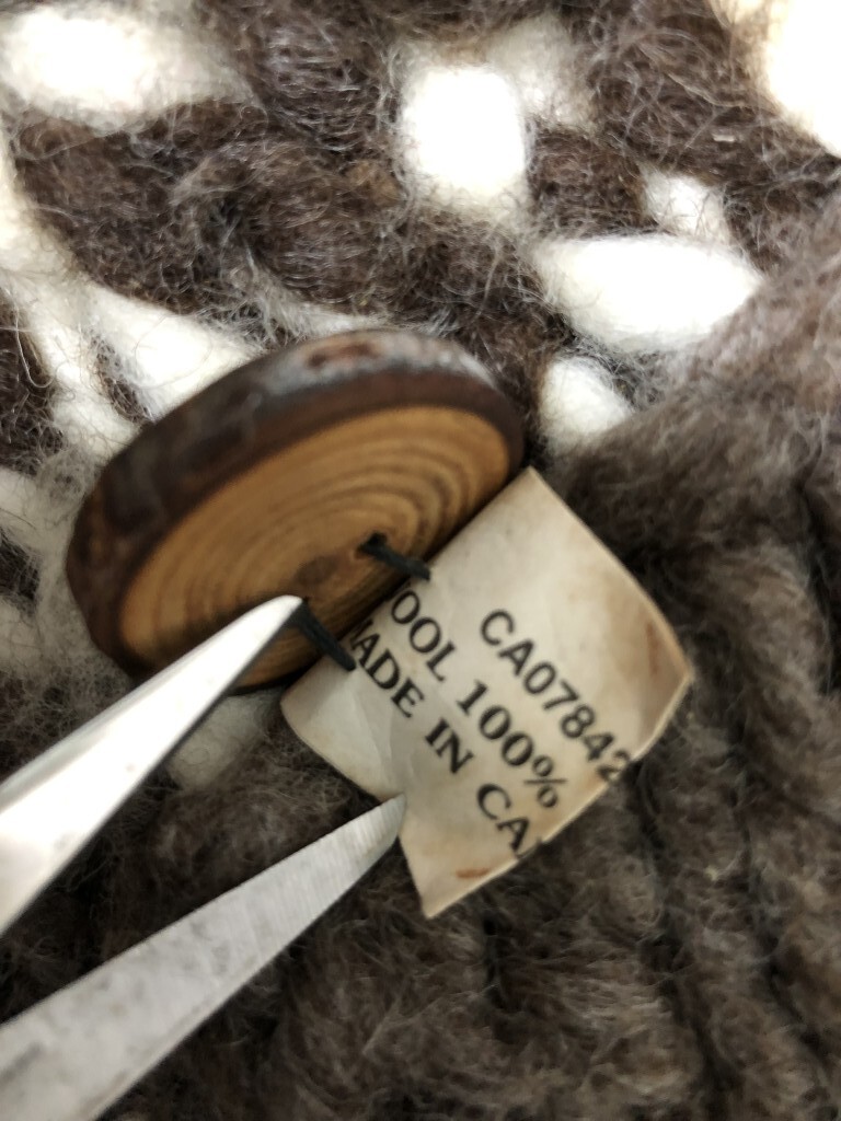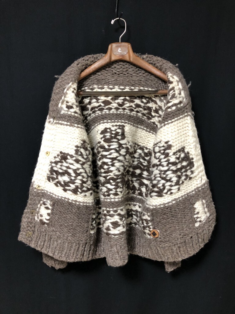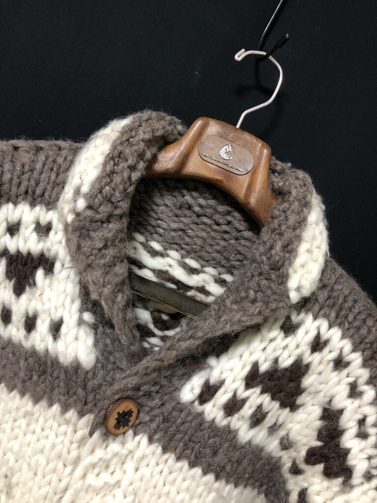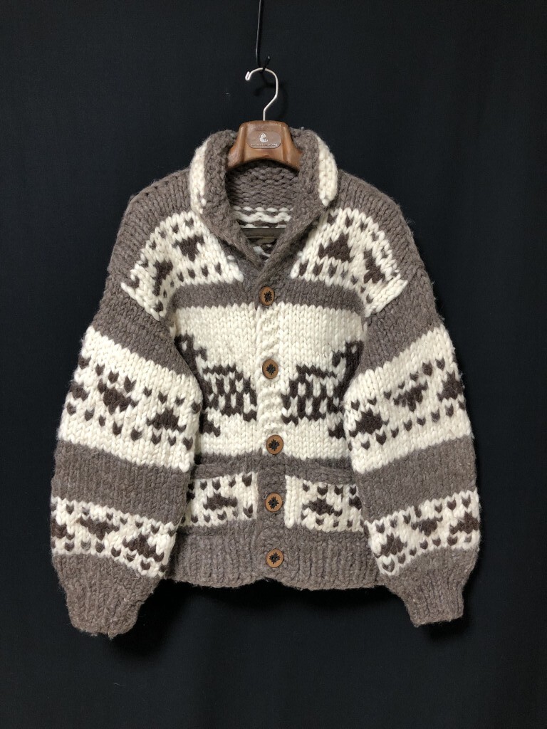 カナダ製◆カウチンプロダクツ カウチンセーター 肉厚本格モデル ウッドボタン CA07842 オフホワイト×茶 サンダーバード柄 雷鳥