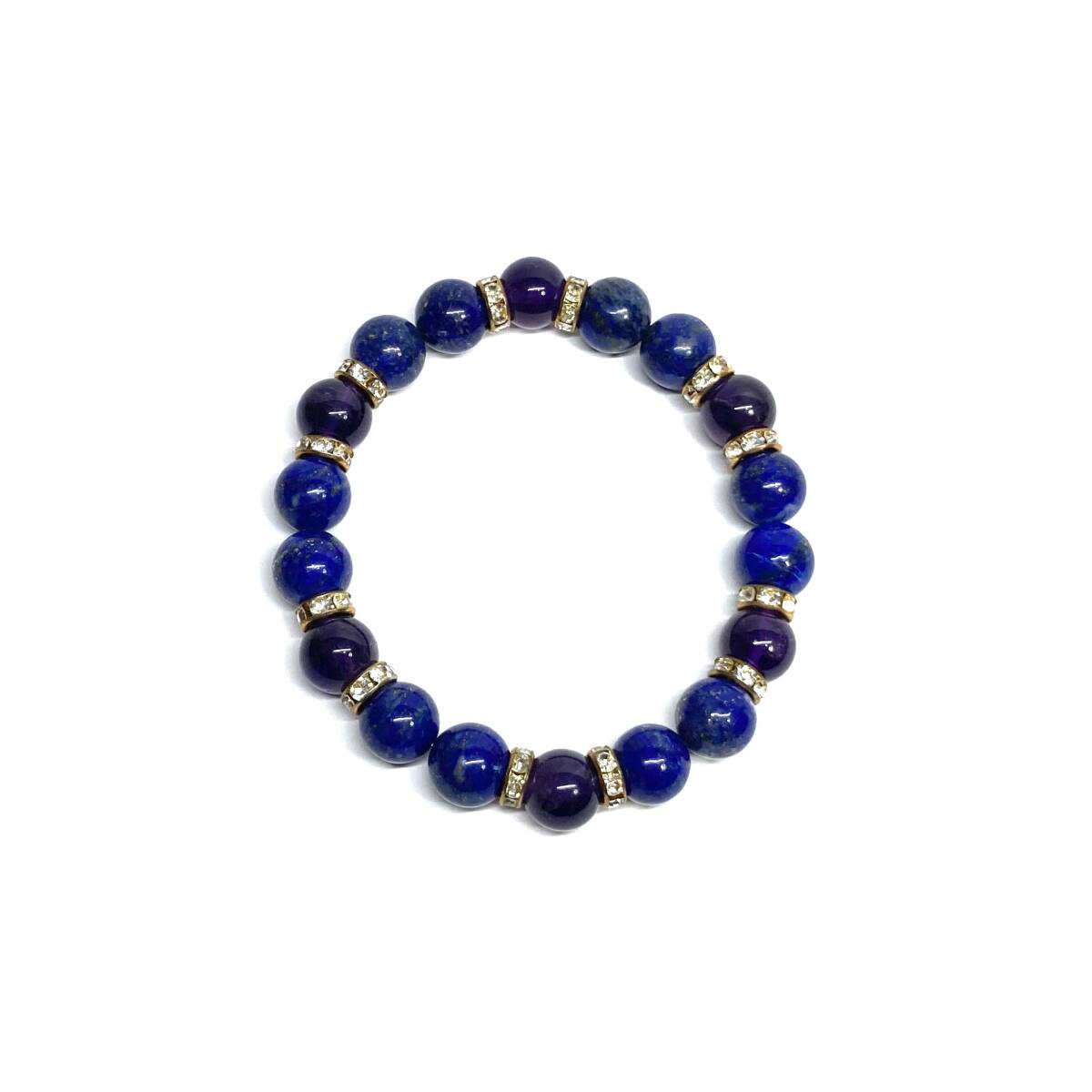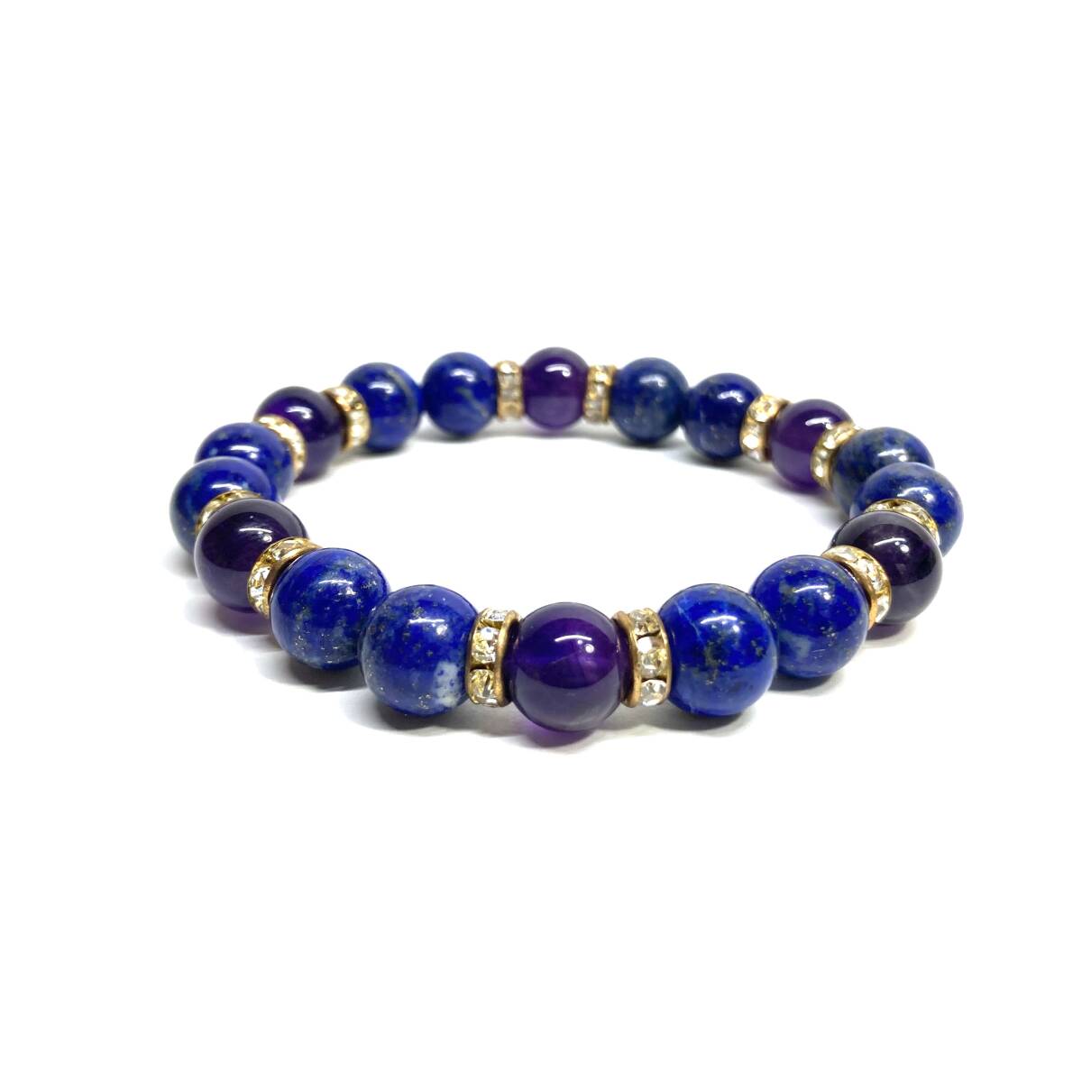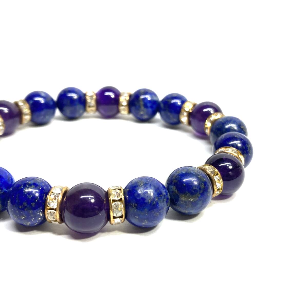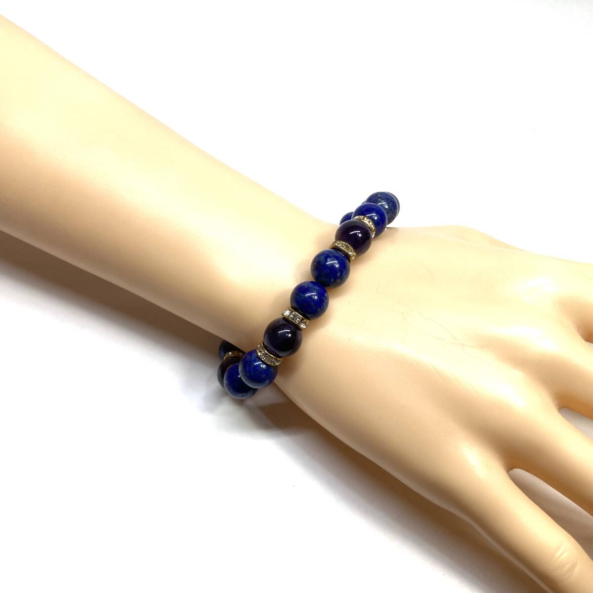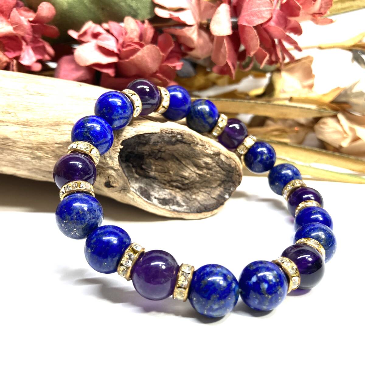 こちらは、ラピスラズリとアメジストを組み合わせたパワーストーンブレスレットです。間にはロンデルを挟み高級感あるデザインに仕上げております。石大きさは腕にも馴染みやすいように10mm玉で内径約18cm(伸可能)です。(サイズ変更の場合は取引ナビにてご連絡をお願いします。) 数に限りがございますので気になる方はお早めにどうぞ。