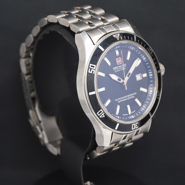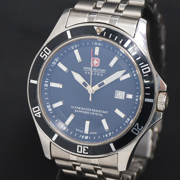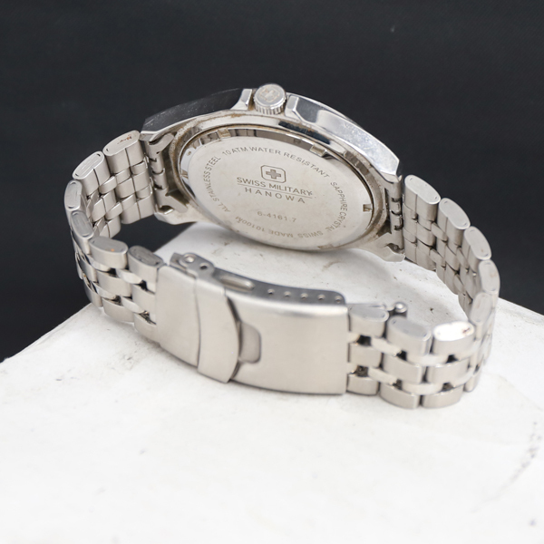 1円 稼働 QZ 良品 スイスミリタリー ハノワ 6-4161.7 黒文字盤 デイト メンズ腕時計 9933000 11APT KRK