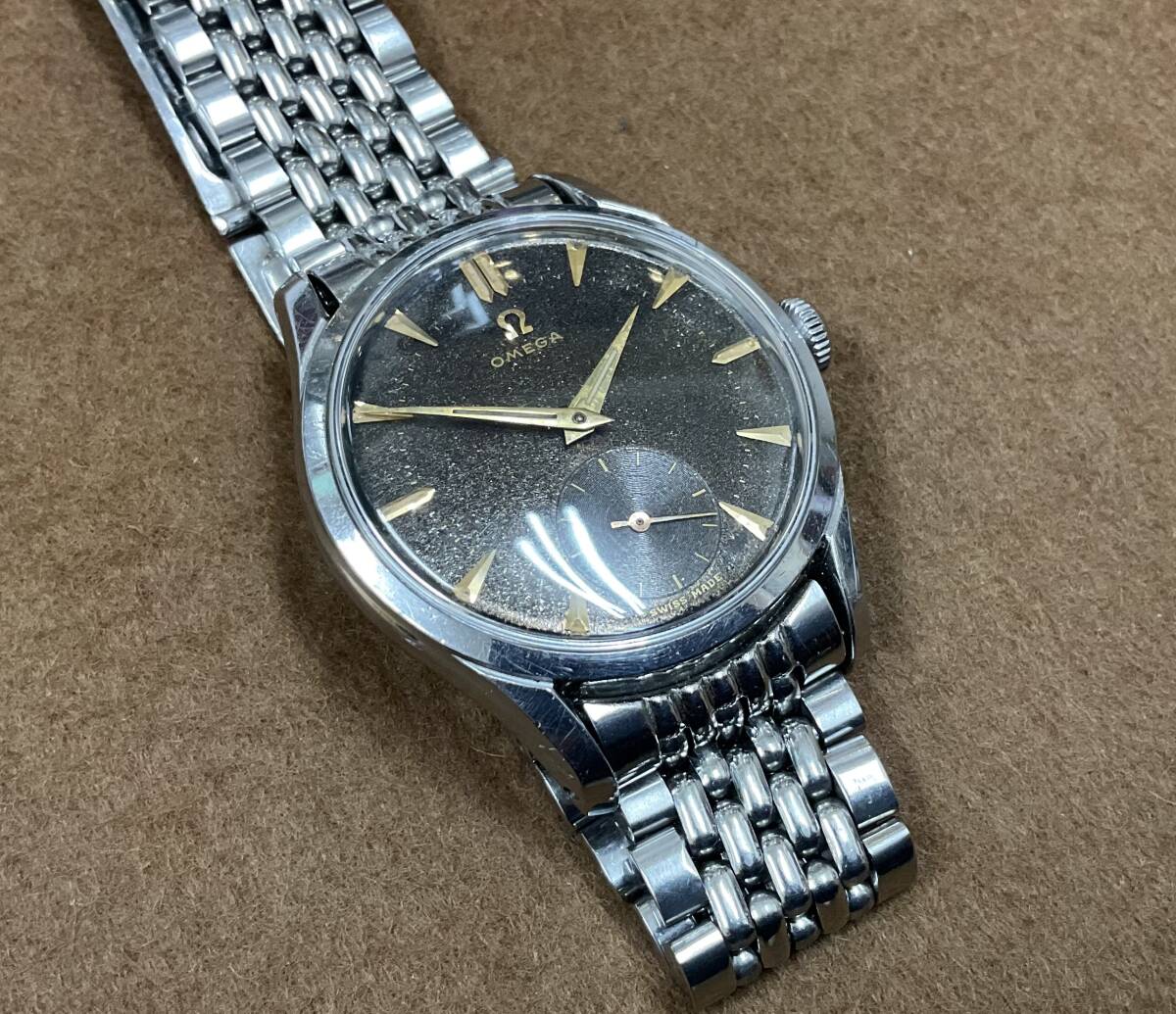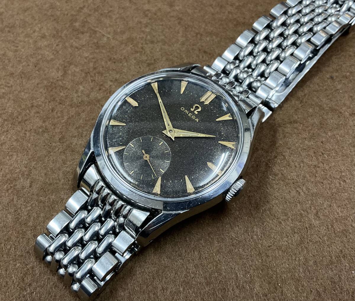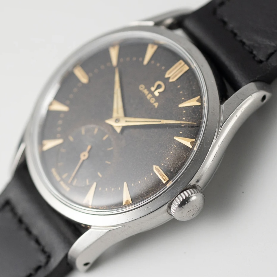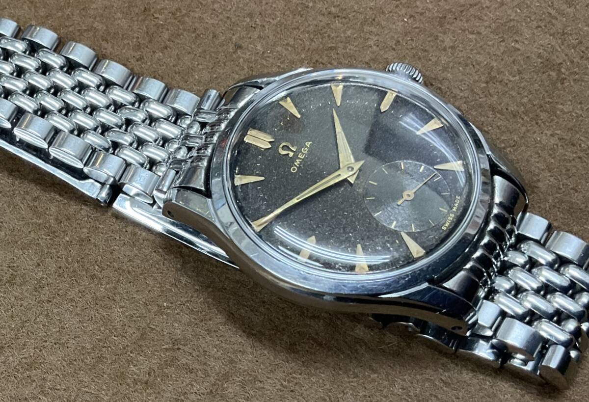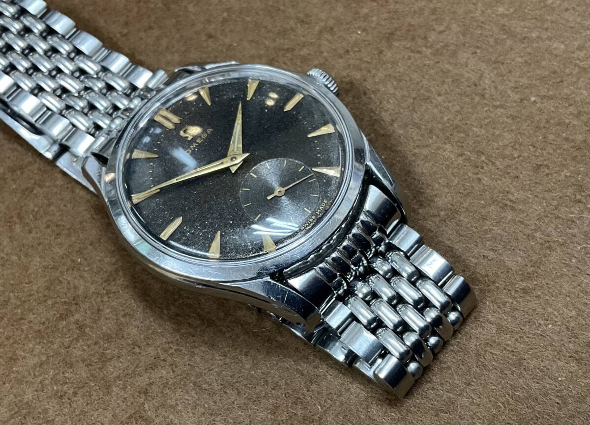 ブラックギルトダイヤルの手巻きオメガ。30mmキャリバーと呼ばれるオメガを長きに渡り牽引した傑作ムーブメントを搭載しています。こちらの品は1951年製としては非常に大きな36mmケースで迫力があります。 スクリューバックのタフな構造ですが、スモールセコンドモデルの為、厚みをあまり感じず、着け心地が良いです。大きなアラビア数字とブラックミラーがスポーツらしさを持っていますが、ゴールドのインデックスと針が、ヴィンテージらしい雰囲気を添えています。 ブラックミラーダイヤルは経年変化にて、ブラウンとキラキラした『ギャラクシー』っぽい状態に変化してきております。 個体固有のvintage感を楽しんでください! ショップの販売保証書あり。 分解清掃後の状態で2024年購入。 腕周り18cmあたりまで可能。 ※新規の方、マイナスの多い方の入札はご遠慮ください。
