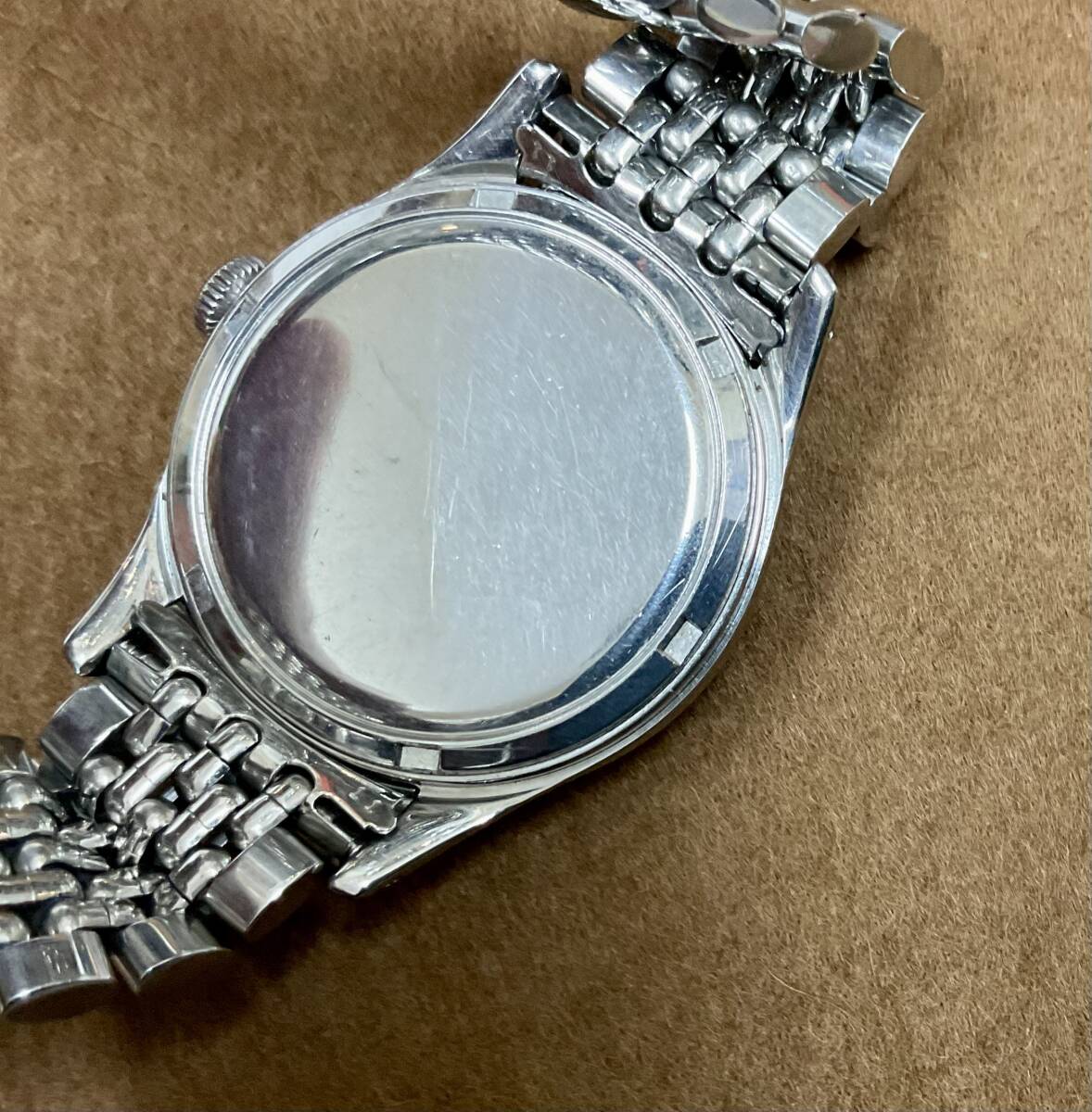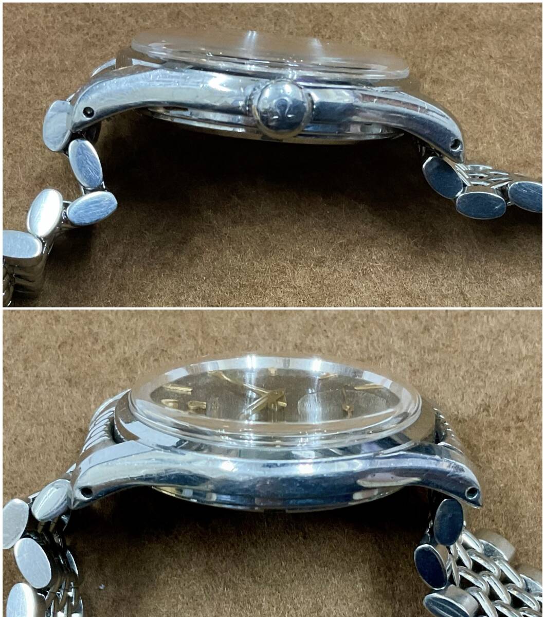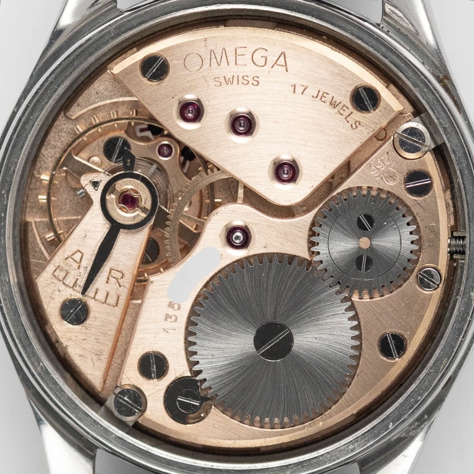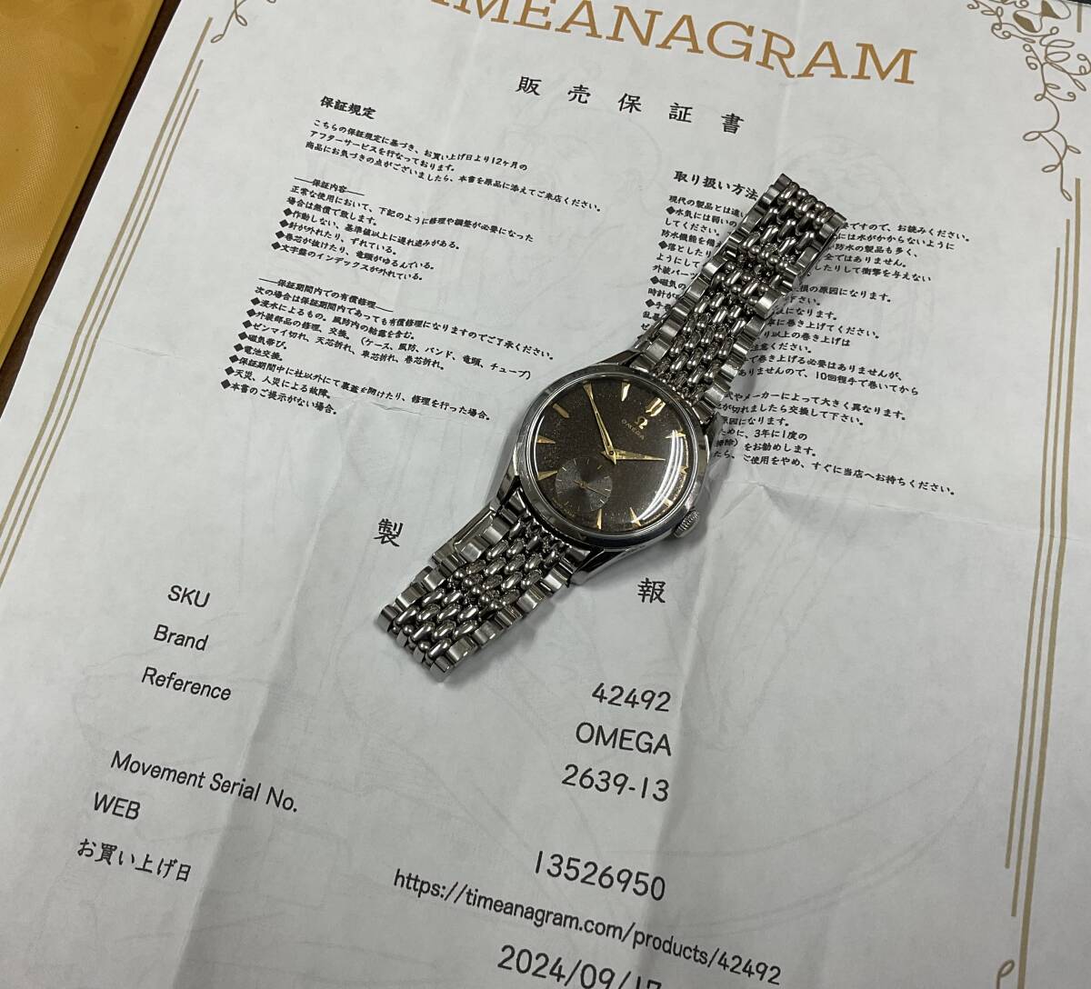 ブラックギルトダイヤルの手巻きオメガ。30mmキャリバーと呼ばれるオメガを長きに渡り牽引した傑作ムーブメントを搭載しています。こちらの品は1951年製としては非常に大きな36mmケースで迫力があります。 スクリューバックのタフな構造ですが、スモールセコンドモデルの為、厚みをあまり感じず、着け心地が良いです。大きなアラビア数字とブラックミラーがスポーツらしさを持っていますが、ゴールドのインデックスと針が、ヴィンテージらしい雰囲気を添えています。 ブラックミラーダイヤルは経年変化にて、ブラウンとキラキラした『ギャラクシー』っぽい状態に変化してきております。 個体固有のvintage感を楽しんでください! ショップの販売保証書あり。 分解清掃後の状態で2024年購入。 腕周り18cmあたりまで可能。 ※新規の方、マイナスの多い方の入札はご遠慮ください。