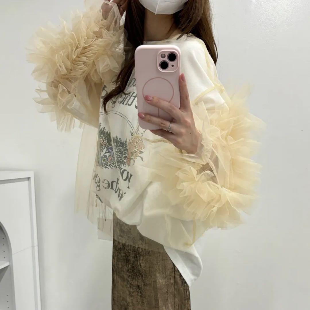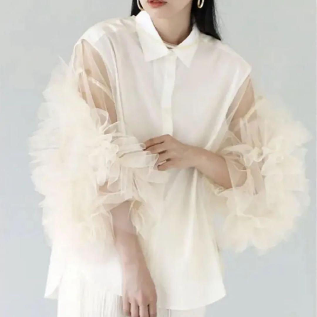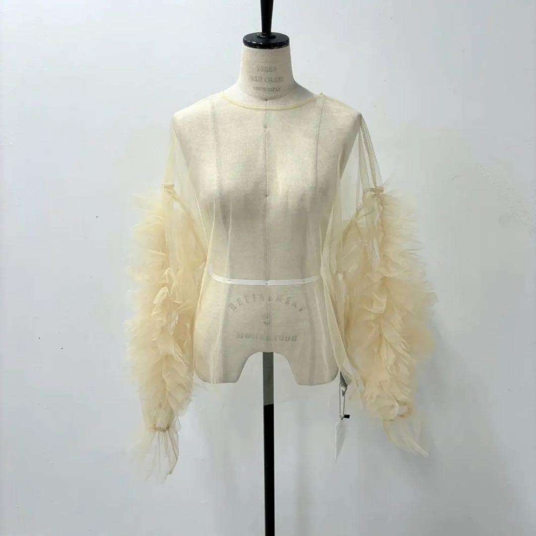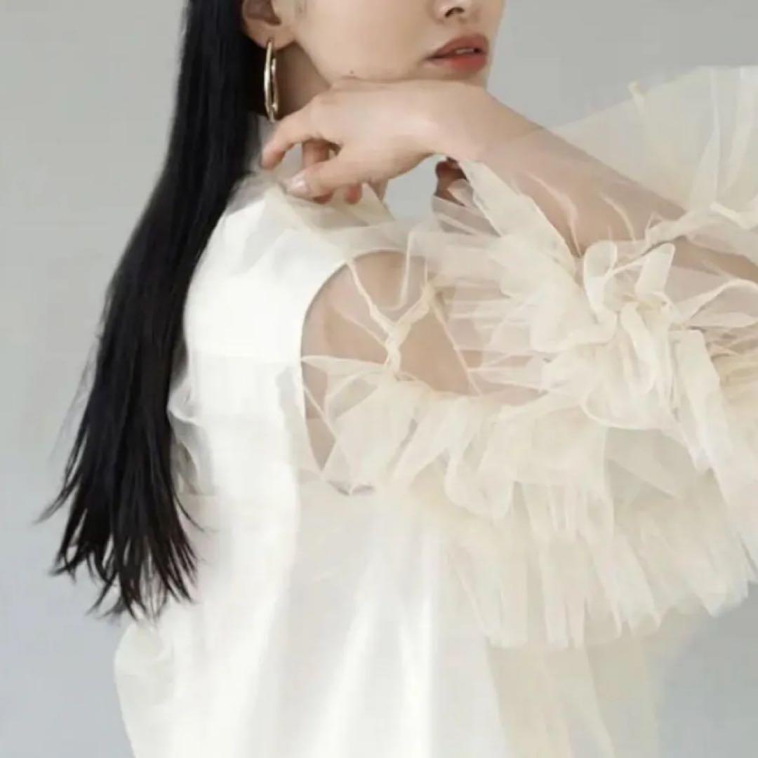 大胆なギャザーフリルが魅力の、mimi memeteのデコフリルスリーブ チュールブラウスです!