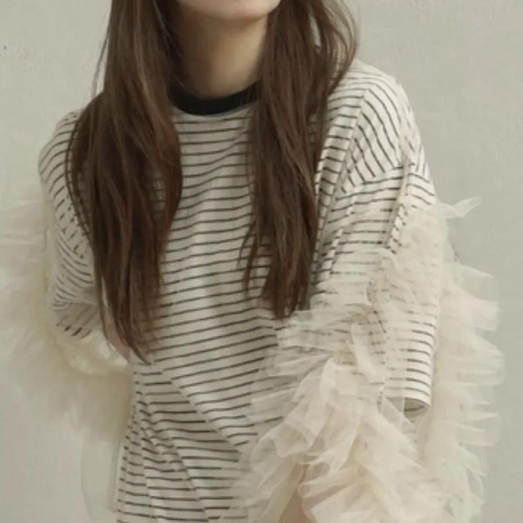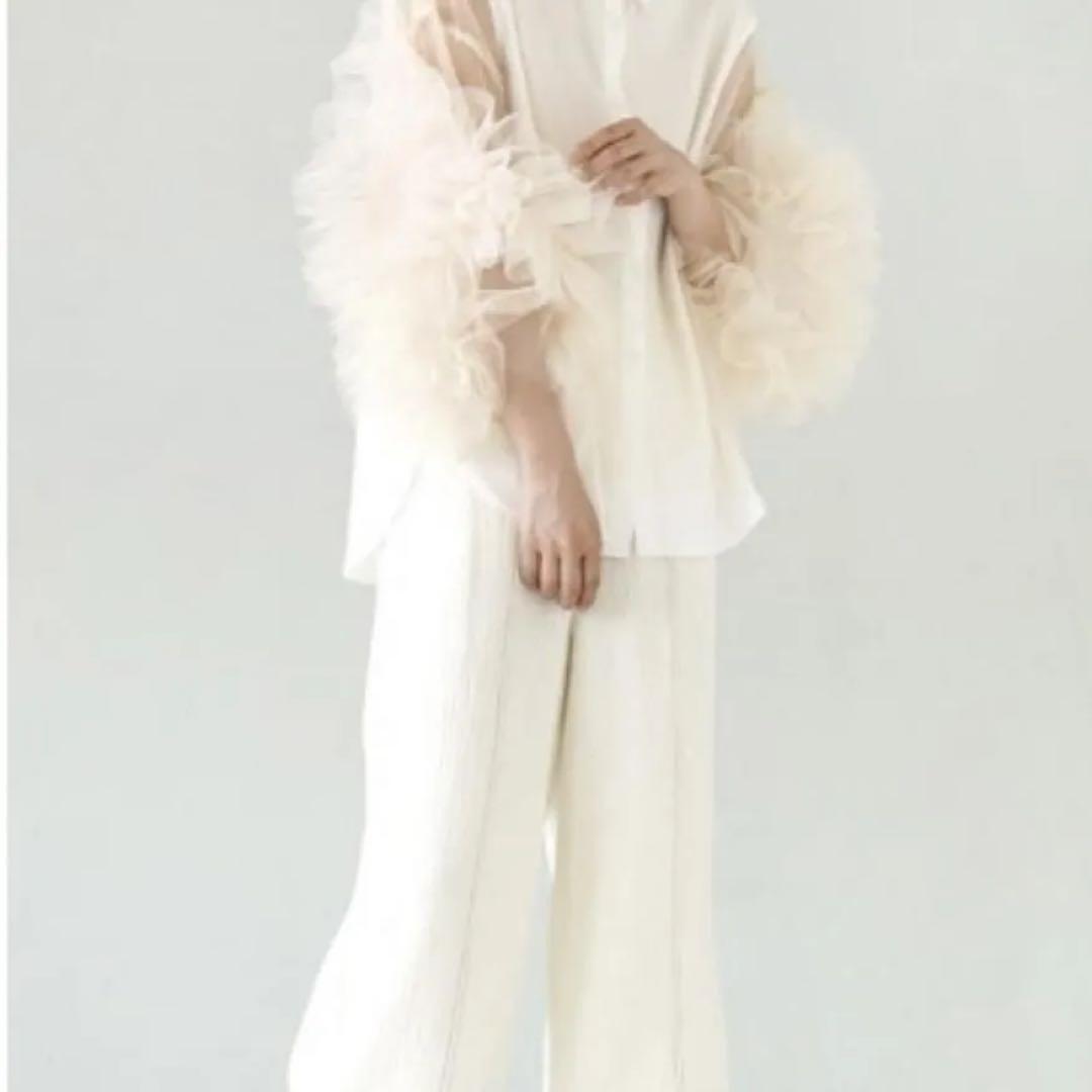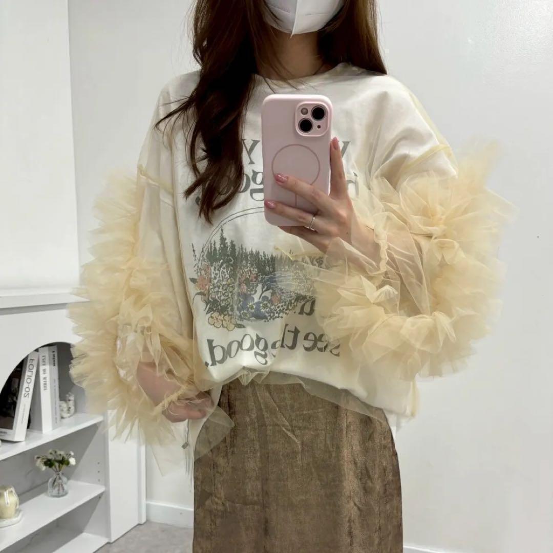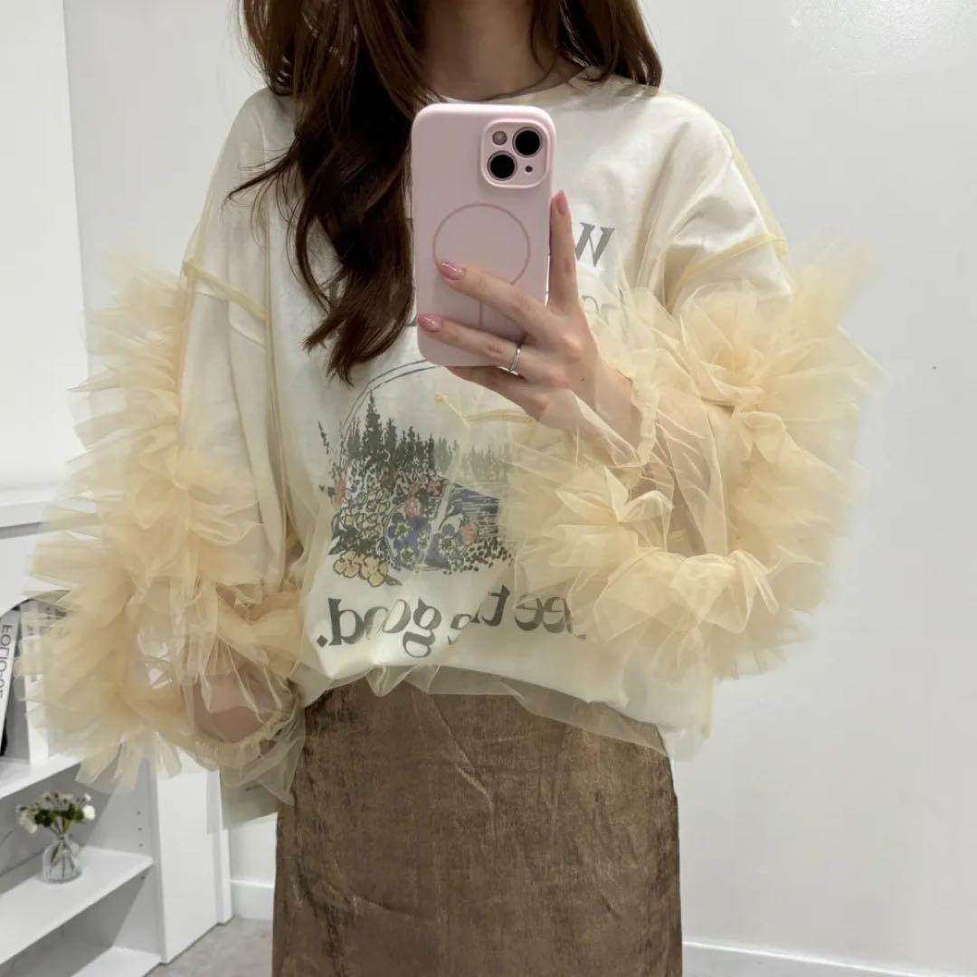 大胆なギャザーフリルが魅力の、mimi memeteのデコフリルスリーブ チュールブラウスです!