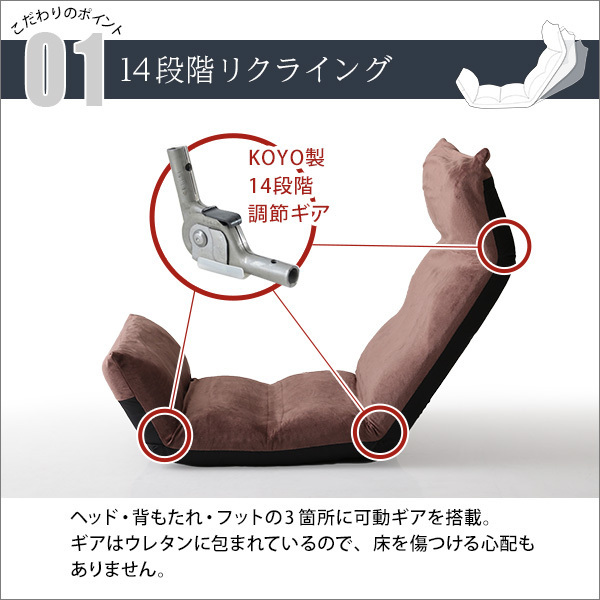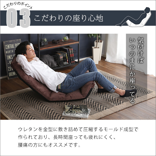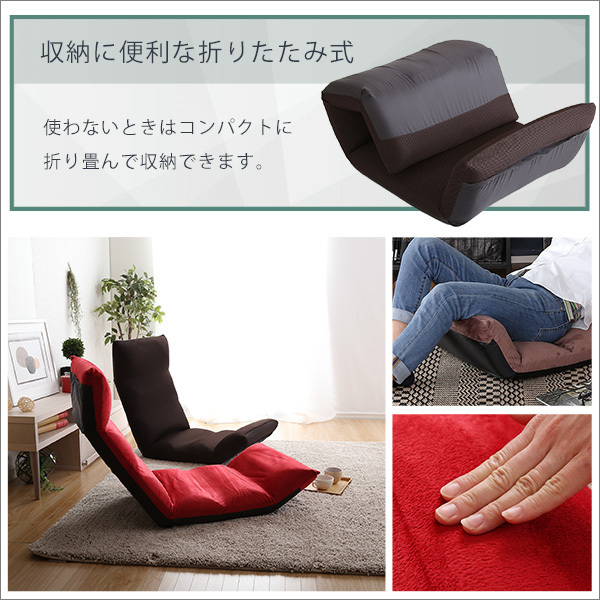 【ポイント】 14段階のギアチェンジで絶妙な角度に調整ができるアップスタイル! しっかりと体を支え、疲れにくい形状になっています。 コンパクトに折り畳むことができるので収納するのにも便利です。 生地はふわふわの起毛タイプとサラッとした通気性のあるメッシュタイプがございます。 |