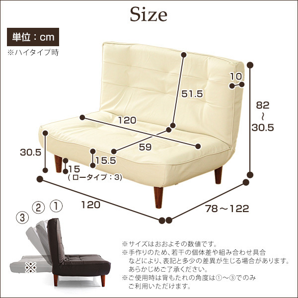 【カラー】 ブラック、ブラウン、アイボリー、レッド 【サイズ】 外寸:幅120x奥行き78~122x高さ30.5~82cm 座面高:30.5cm(脚の高さ:15cm) 【重量】 16kg 【素材】 構造材:スチールパイプ クッション材:ウレタン(モールド成型)、ポケットコイルスプリング 脚部:ポリプロピレン 生地:合成皮革(PVC) 【梱包】 サイズ:120x120x20cm、重量:18kg 【その他】 生産国:日本 【完成品】 脚のみお客様取付けになります。 【ご注意】 ・サイズ、重量は概算です。 ・商品カラーはご使用のモニターによって実際の明るさや色と異なって見える場合がございます。 |