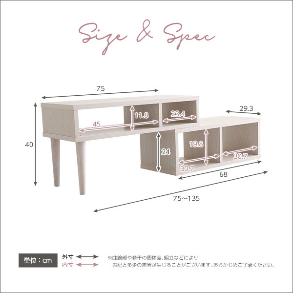【カラー】 オーク、ウォールナット、ホワイトオーク 【サイズ】 幅75~135x奥行29.5x高さ40cm 【重量】 12.8kg 【素材】 本体:パーチクルボード、MDF 脚部:天然木 表面材:プリント紙化粧合板、PVC 【梱包】 サイズ:87.7x33.4x14.6cm、重量:13.5kg 【組み立て品】 お客様による組み立てが必要です。 【ご注意】 ・サイズ、重量は概算です。 ・商品カラーはご使用のモニターによって実際の明るさや色と異なって見える場合がございます。 |