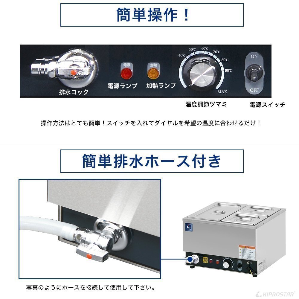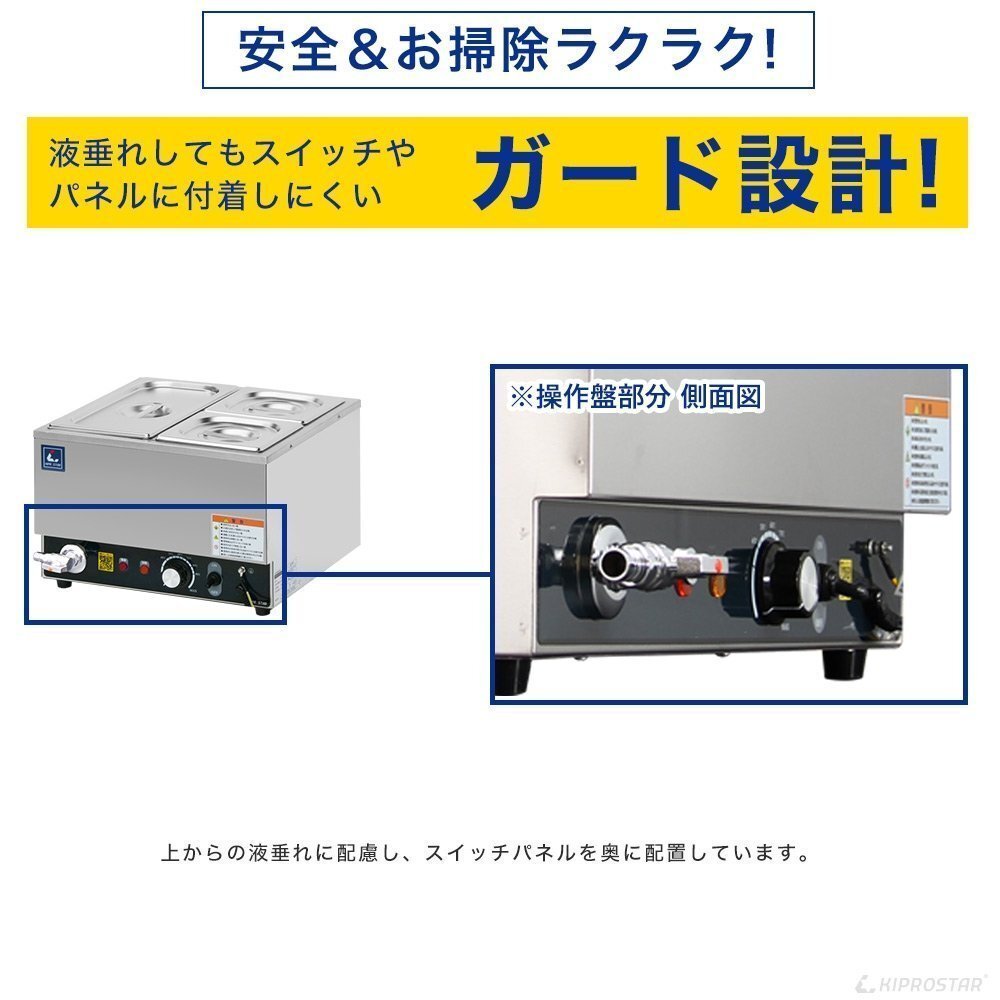 | 特長 | ・熱効率を高める特殊構造となっており、業務用フードウォーマー省エネを実現。 【ホテルパン容量】 1/3 約5.7L、1/6 約2.5L **満水時の容量です** |