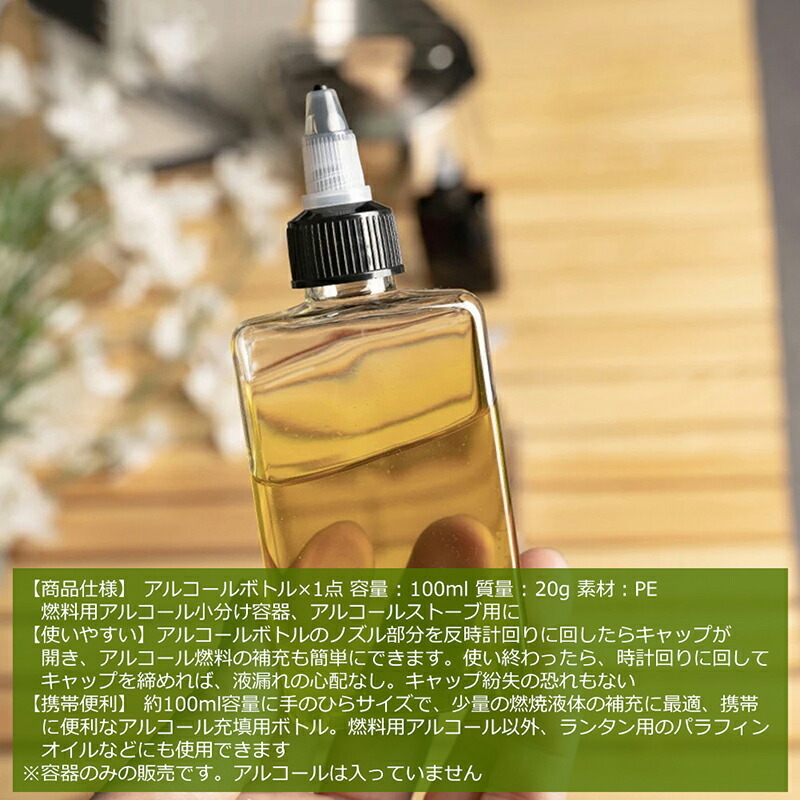 【商品仕様】 アルコールボトル×1点 容量 : 100ml 質量 : 20g 素材:PE燃料用アルコール小分け容器、アルコールストーブ用に