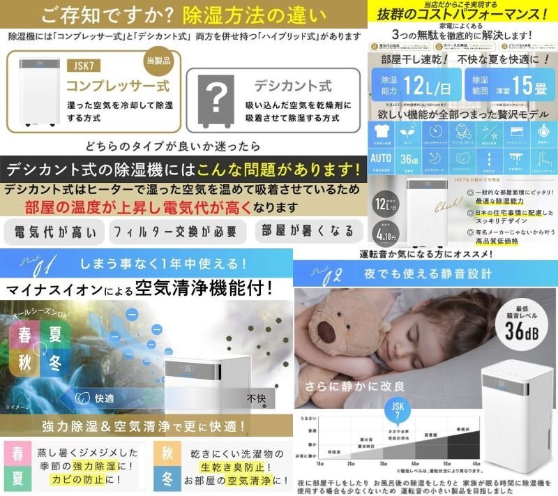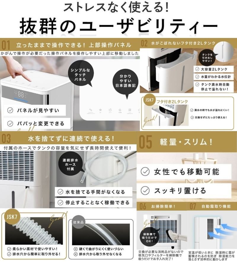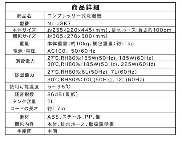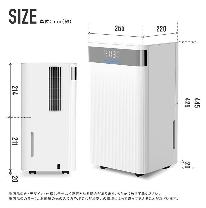 | 商品説明 | 小型ハイパワーコンプレッサー式除湿機 12段階の湿度調節での自動運転機能 1日最大12L除湿! 蓋つきタンクは水量がわかる水位計つき 排水ホースで連続排水も可能 立ったままで操作できる上部操作差パネル 持ち上げずに移動できる キャスター付きで移動も楽ちん 交換必要な消耗品がないのでお掃除簡単 ■三種類の除湿モード ■二段階風量切り替え ■12段階の湿度調整機能 ■連続除湿 ■1-24 時間タイマー ■チャイルドロック ■自動霜取り ■蓋付きタンク ■商品サイズ:約W255×D220×445mm(mm) ■重量:約10kg ■付属品:取扱説明書 排水ホース 異音がありますが使用に問題はありません。 |